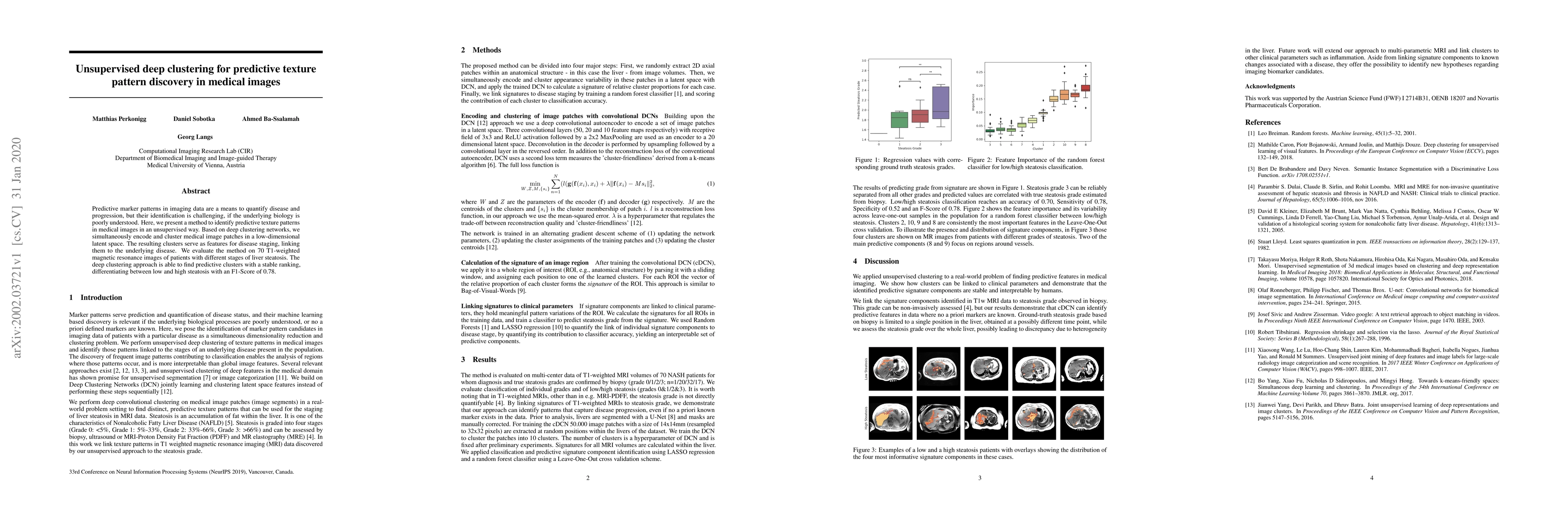 This paper introduces an unsupervised deep clustering method to identify predictive texture patterns in medical images, specifically for disease staging in liver steatosis. The method encodes and clusters image patches to discover features linked to disease progression, achieving an F1-Score of 0.78 for differentiating steatosis stages.
