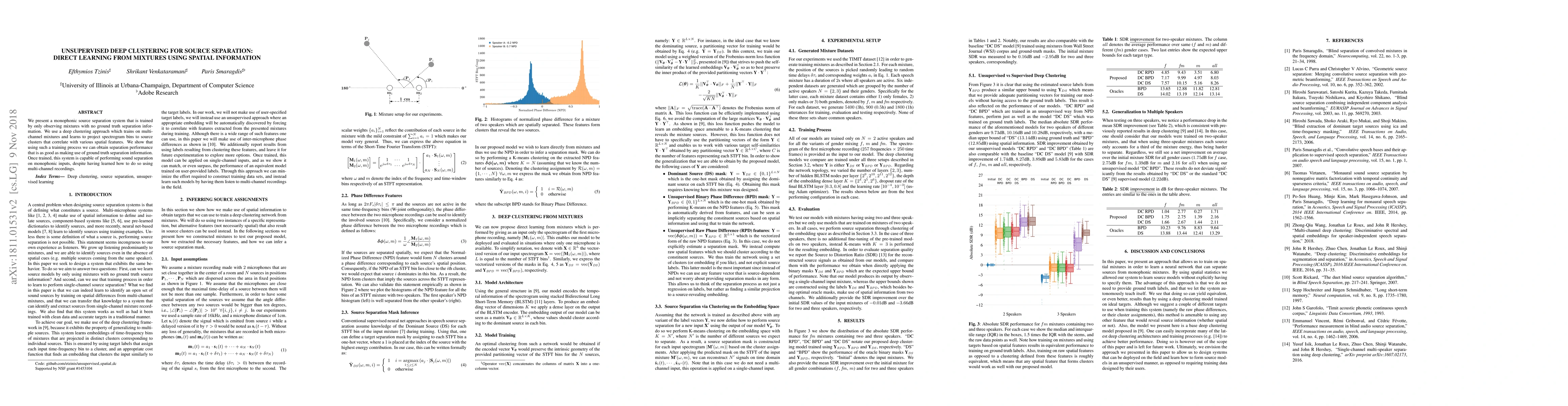 This paper introduces an unsupervised deep clustering method for monophonic source separation, trained solely on mixtures without ground truth separation. It leverages spatial information to cluster spectrogram bins, achieving separation performance comparable to supervised methods.