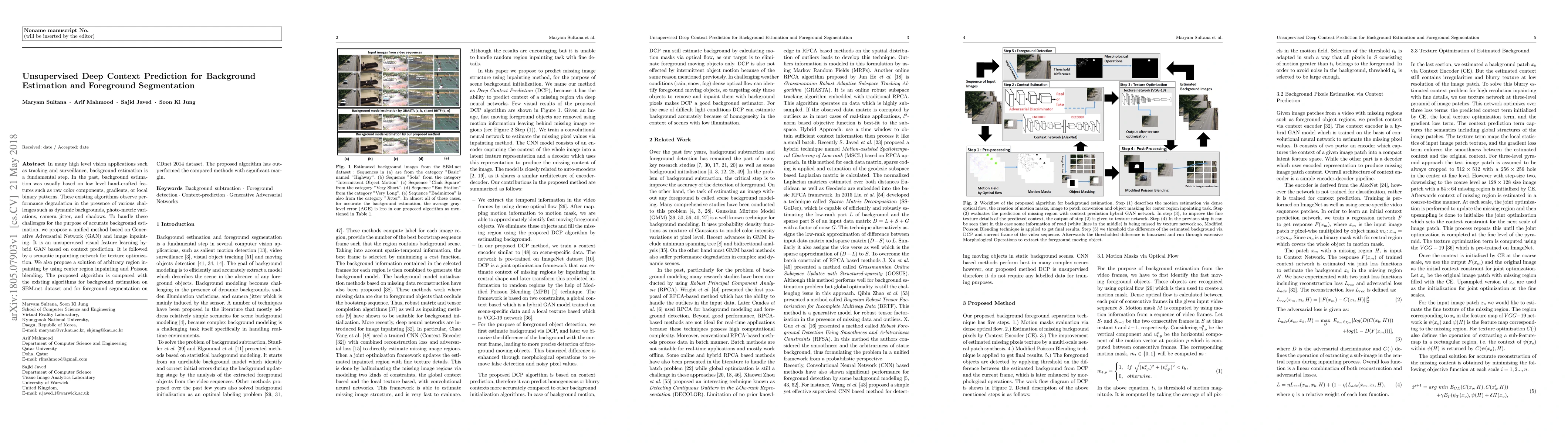 In many advanced video based applications background modeling is a pre-processing step to eliminate redundant data, for instance in tracking or video surveillance applications. Over the past years background subtraction is usually based on low level or hand-crafted features such as raw color components, gradients, or local binary patterns. The background subtraction algorithms performance suffer in the presence of various challenges such as dynamic backgrounds, photometric variations, camera jitters, and shadows. To handle these challenges for the purpose of accurate background modeling we propose a unified framework based on the algorithm of image inpainting. It is an unsupervised visual feature learning hybrid Generative Adversarial algorithm based on context prediction. We have also presented the solution of random region inpainting by the fusion of center region inpaiting and random region inpainting with the help of poisson blending technique. Furthermore we also evaluated foreground object detection with the fusion of our proposed method and morphological operations. The comparison of our proposed method with 12 state-of-the-art methods shows its stability in the application of background estimation and foreground detection.
