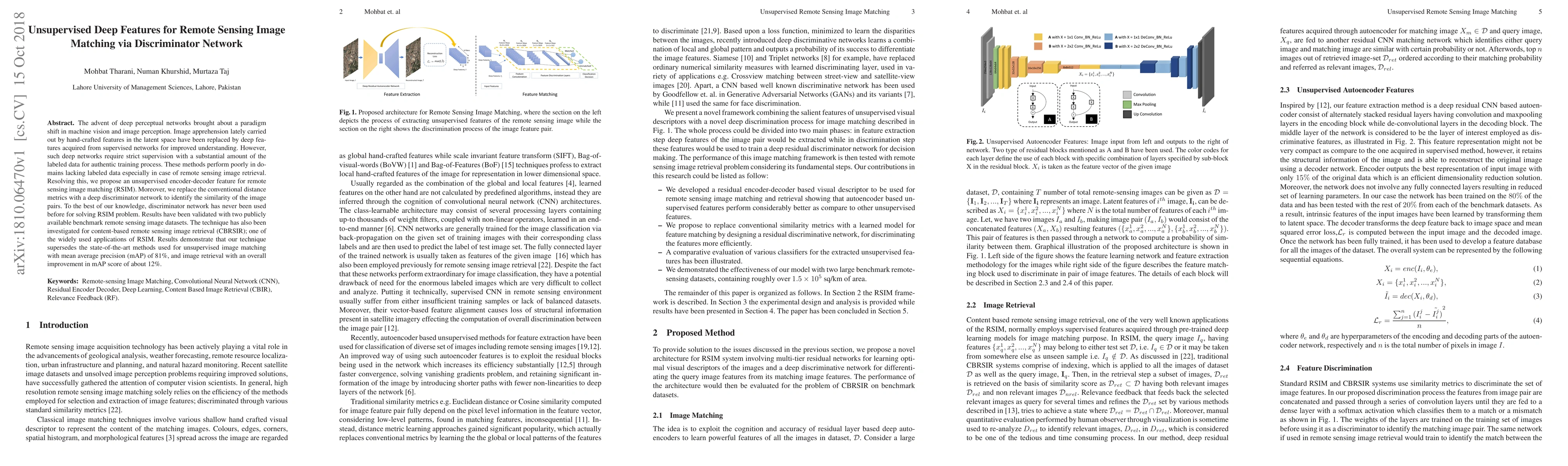 The advent of deep perceptual networks brought about a paradigm shift in machine vision and image perception. Image apprehension lately carried out by hand-crafted features in the latent space have been replaced by deep features acquired from supervised networks for improved understanding. However, such deep networks require strict supervision with a substantial amount of the labeled data for authentic training process. These methods perform poorly in domains lacking labeled data especially in case of remote sensing image retrieval. Resolving this, we propose an unsupervised encoder-decoder feature for remote sensing image matching (RSIM). Moreover, we replace the conventional distance metrics with a deep discriminator network to identify the similarity of the image pairs. To the best of our knowledge, discriminator network has never been used before for solving RSIM problem. Results have been validated with two publicly available benchmark remote sensing image datasets. The technique has also been investigated for content-based remote sensing image retrieval (CBRSIR); one of the widely used applications of RSIM. Results demonstrate that our technique supersedes the state-of-the-art methods used for unsupervised image matching with mean average precision (mAP) of 81%, and image retrieval with an overall improvement in mAP score of about 12%.