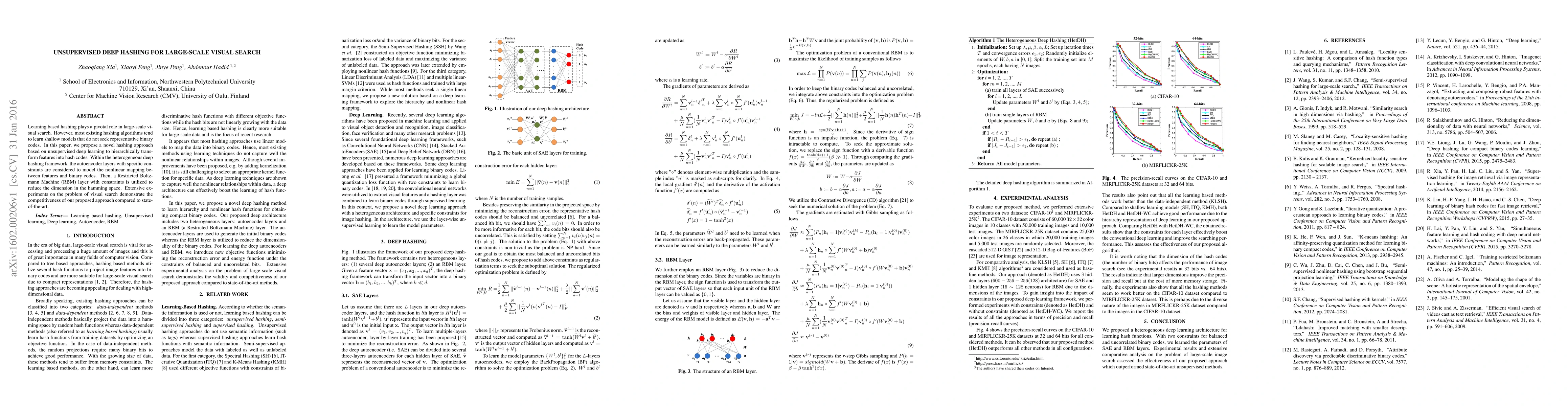 Learning based hashing plays a pivotal role in large-scale visual search. However, most existing hashing algorithms tend to learn shallow models that do not seek representative binary codes. In this paper, we propose a novel hashing approach based on unsupervised deep learning to hierarchically transform features into hash codes. Within the heterogeneous deep hashing framework, the autoencoder layers with specific constraints are considered to model the nonlinear mapping between features and binary codes. Then, a Restricted Boltzmann Machine (RBM) layer with constraints is utilized to reduce the dimension in the hamming space. Extensive experiments on the problem of visual search demonstrate the competitiveness of our proposed approach compared to state-of-the-art.