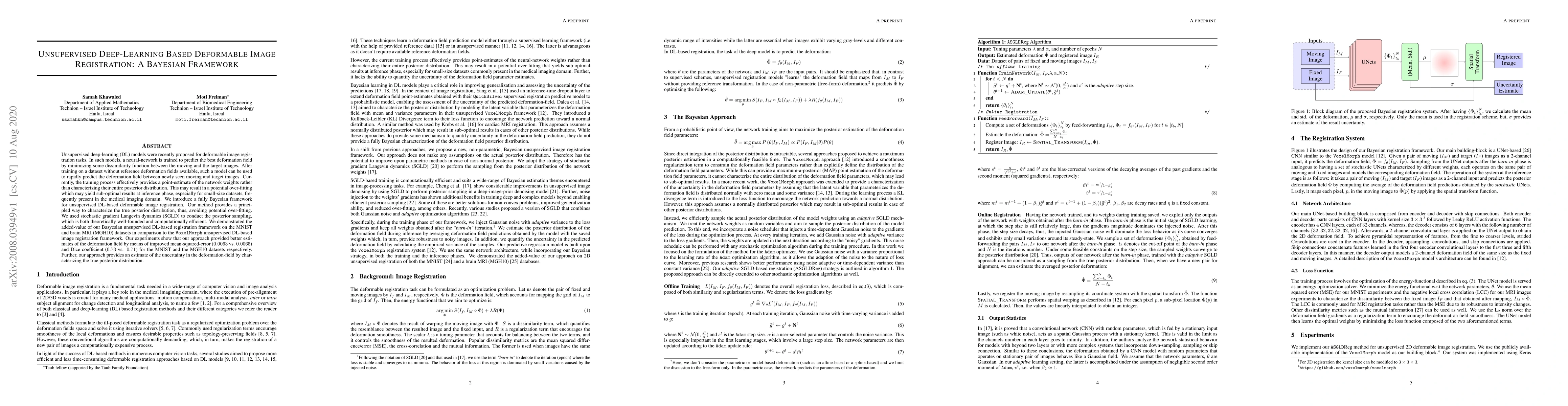 Unsupervised deep-learning (DL) models were recently proposed for deformable image registration tasks. In such models, a neural-network is trained to predict the best deformation field by minimizing some dissimilarity function between the moving and the target images. After training on a dataset without reference deformation fields available, such a model can be used to rapidly predict the deformation field between newly seen moving and target images. Currently, the training process effectively provides a point-estimate of the network weights rather than characterizing their entire posterior distribution. This may result in a potential over-fitting which may yield sub-optimal results at inference phase, especially for small-size datasets, frequently present in the medical imaging domain. We introduce a fully Bayesian framework for unsupervised DL-based deformable image registration. Our method provides a principled way to characterize the true posterior distribution, thus, avoiding potential over-fitting. We used stochastic gradient Langevin dynamics (SGLD) to conduct the posterior sampling, which is both theoretically well-founded and computationally efficient. We demonstrated the added-value of our Basyesian unsupervised DL-based registration framework on the MNIST and brain MRI (MGH10) datasets in comparison to the VoxelMorph unsupervised DL-based image registration framework. Our experiments show that our approach provided better estimates of the deformation field by means of improved mean-squared-error ($0.0063$ vs. $0.0065$) and Dice coefficient ($0.73$ vs. $0.71$) for the MNIST and the MGH10 datasets respectively. Further, our approach provides an estimate of the uncertainty in the deformation-field by characterizing the true posterior distribution.