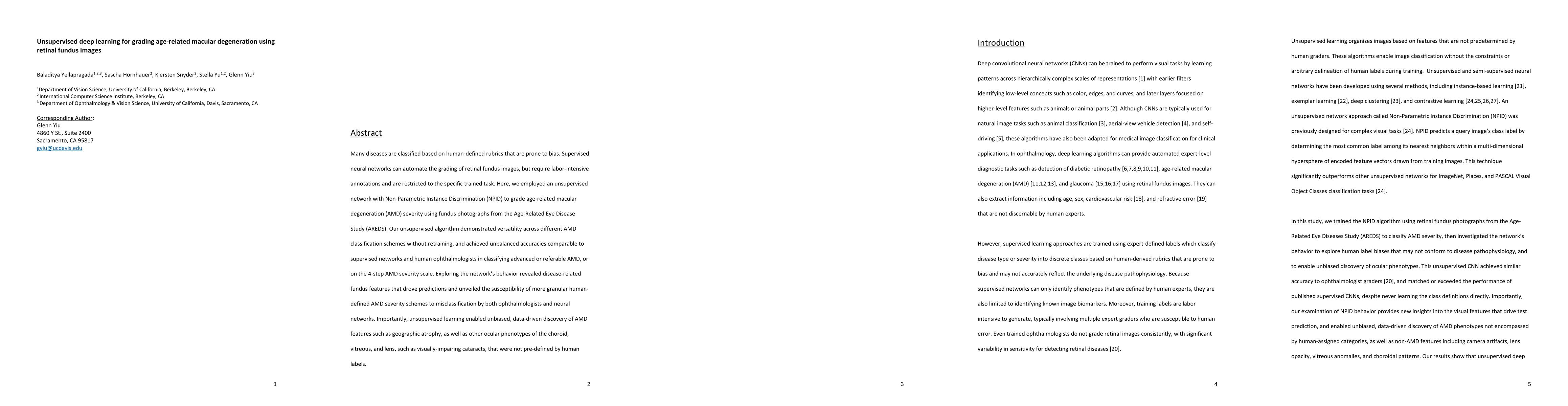 Many diseases are classified based on human-defined rubrics that are prone to bias. Supervised neural networks can automate the grading of retinal fundus images, but require labor-intensive annotations and are restricted to the specific trained task. Here, we employed an unsupervised network with Non-Parametric Instance Discrimination (NPID) to grade age-related macular degeneration (AMD) severity using fundus photographs from the Age-Related Eye Disease Study (AREDS). Our unsupervised algorithm demonstrated versatility across different AMD classification schemes without retraining, and achieved unbalanced accuracies comparable to supervised networks and human ophthalmologists in classifying advanced or referable AMD, or on the 4-step AMD severity scale. Exploring the networks behavior revealed disease-related fundus features that drove predictions and unveiled the susceptibility of more granular human-defined AMD severity schemes to misclassification by both ophthalmologists and neural networks. Importantly, unsupervised learning enabled unbiased, data-driven discovery of AMD features such as geographic atrophy, as well as other ocular phenotypes of the choroid, vitreous, and lens, such as visually-impairing cataracts, that were not pre-defined by human labels.