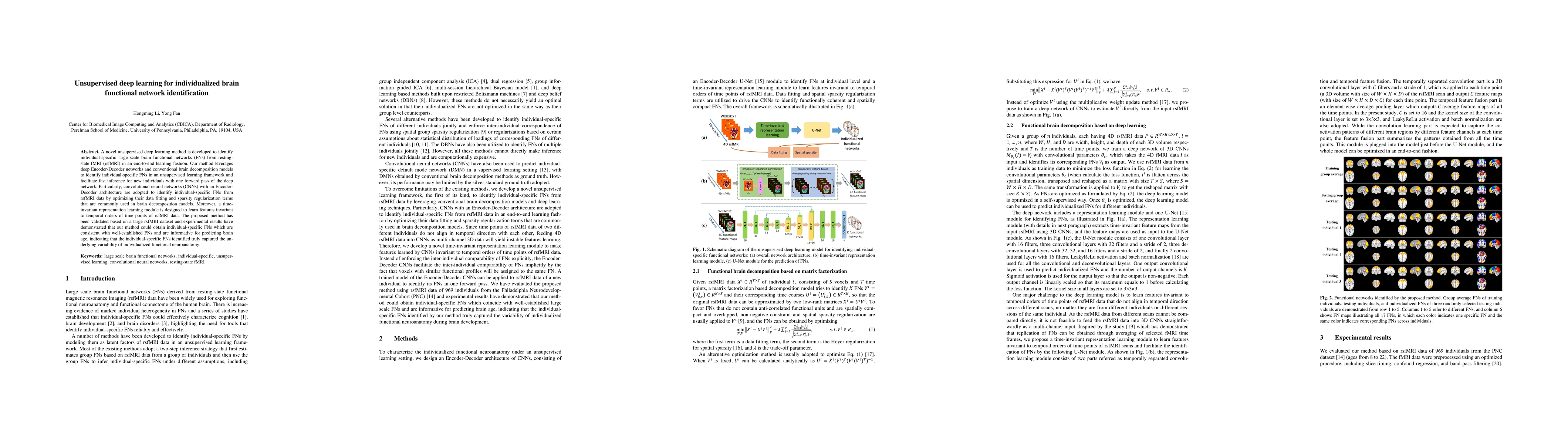 This paper introduces an unsupervised deep learning method using Encoder-Decoder networks and CNNs to identify individual-specific brain functional networks from resting-state fMRI. The method demonstrates consistency with established networks and shows potential for predicting brain age, indicating its effectiveness in capturing individualized functional neuroanatomy.