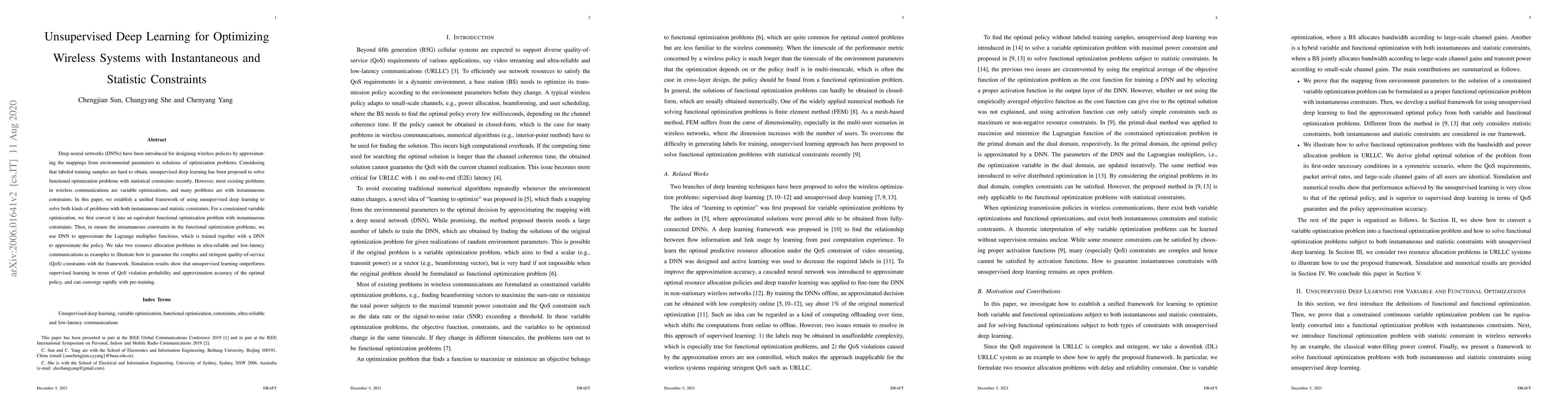 This paper proposes a unified framework for using unsupervised deep learning to optimize wireless systems under both instantaneous and statistical constraints. It employs deep neural networks to approximate Lagrange multiplier functions and optimize policies, demonstrating improved performance in ultra-reliable and low-latency communications compared to supervised learning.