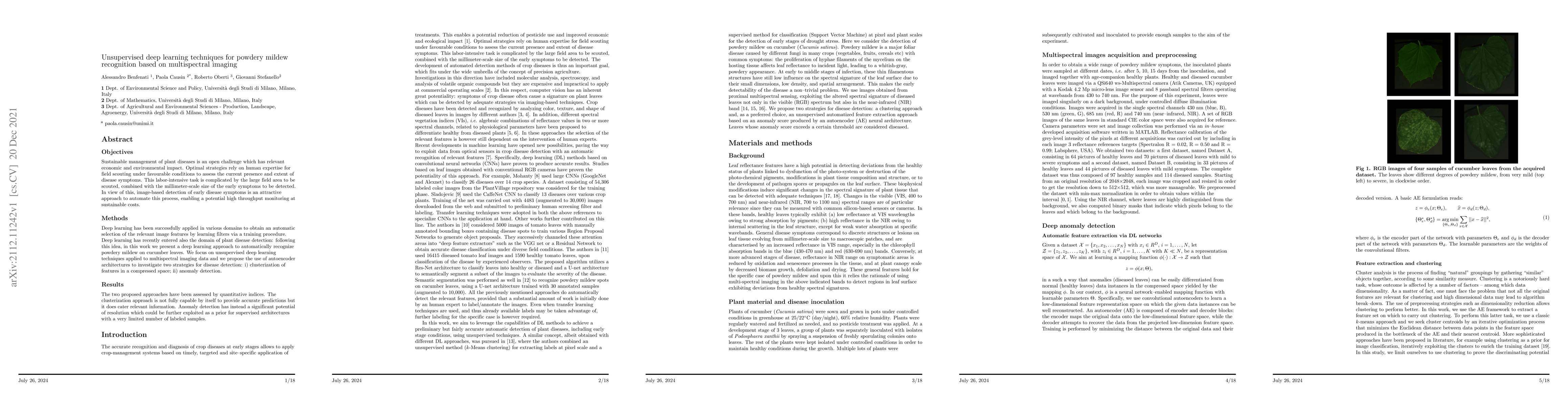 Objectives. Sustainable management of plant diseases is an open challenge which has relevant economic and environmental impact. Optimal strategies rely on human expertise for field scouting under favourable conditions to assess the current presence and extent of disease symptoms. This labor-intensive task is complicated by the large field area to be scouted, combined with the millimeter-scale size of the early symptoms to be detected. In view of this, image-based detection of early disease symptoms is an attractive approach to automate this process, enabling a potential high throughput monitoring at sustainable costs. Methods. Deep learning has been successfully applied in various domains to obtain an automatic selection of the relevant image features by learning filters via a training procedure. Deep learning has recently entered also the domain of plant disease detection: following this idea, in this work we present a deep learning approach to automatically recognize powdery mildew on cucumber leaves. We focus on unsupervised deep learning techniques applied to multispectral imaging data and we propose the use of autoencoder architectures to investigate two strategies for disease detection: i) clusterization of features in a compressed space; ii) anomaly detection. Results. The two proposed approaches have been assessed by quantitative indices. The clusterization approach is not fully capable by itself to provide accurate predictions but it does cater relevant information. Anomaly detection has instead a significant potential of resolution which could be further exploited as a prior for supervised architectures with a very limited number of labeled samples.