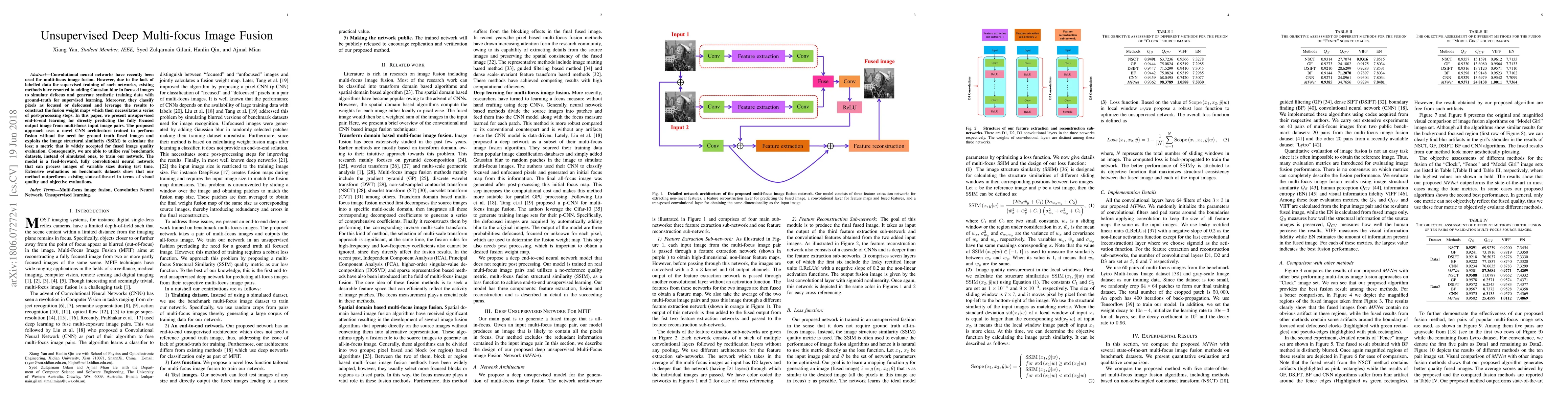 This paper proposes an unsupervised deep learning method for multi-focus image fusion using a novel CNN architecture that directly predicts a fully focused output from input pairs without requiring labeled data. The model is trained using structural similarity (SSIM) and outperforms existing methods in both visual quality and objective evaluations.