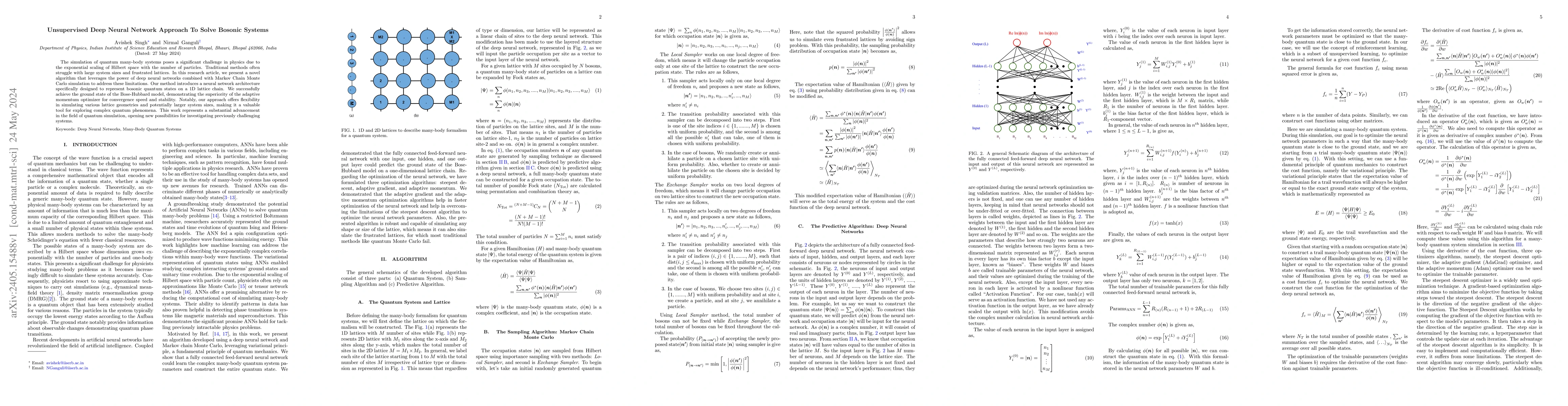 The simulation of quantum many-body systems poses a significant challenge in physics due to the exponential scaling of Hilbert space with the number of particles. Traditional methods often struggle with large system sizes and frustrated lattices. In this research article, we present a novel algorithm that leverages the power of deep neural networks combined with Markov Chain Monte Carlo simulation to address these limitations. Our method introduces a neural network architecture specifically designed to represent bosonic quantum states on a 1D lattice chain. We successfully achieve the ground state of the Bose-Hubbard model, demonstrating the superiority of the adaptive momentum optimizer for convergence speed and stability. Notably, our approach offers flexibility in simulating various lattice geometries and potentially larger system sizes, making it a valuable tool for exploring complex quantum phenomena. This work represents a substantial advancement in the field of quantum simulation, opening new possibilities for investigating previously challenging systems.