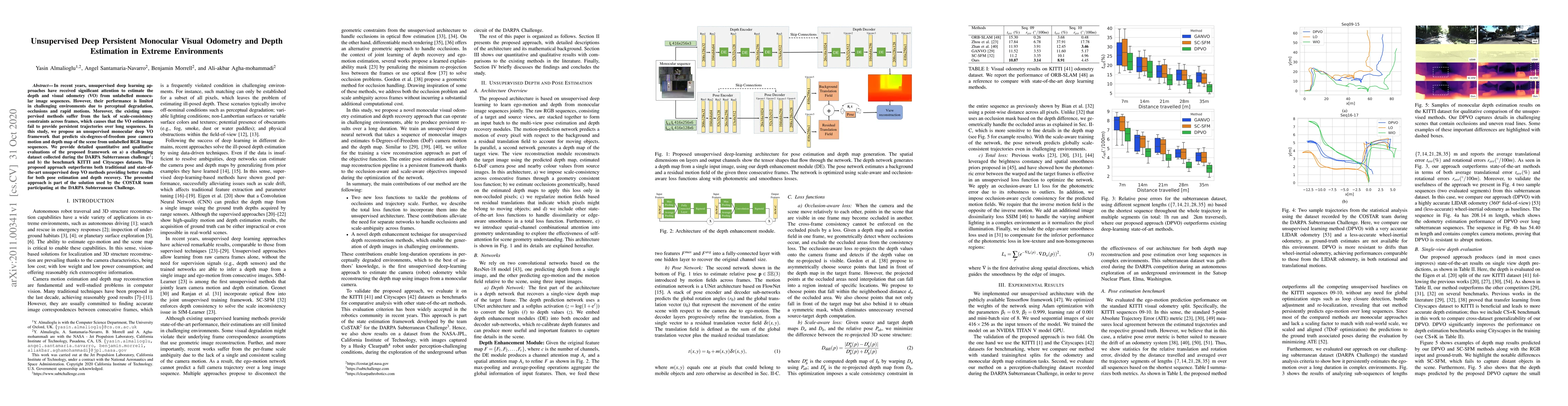 This research introduces an unsupervised deep learning framework for monocular visual odometry and depth estimation, addressing performance limitations in extreme environments. The proposed method demonstrates superior pose estimation and depth recovery, outperforming traditional and state-of-the-art techniques, validated through evaluations on DARPA Subterranean, KITTI, and Cityscapes datasets.