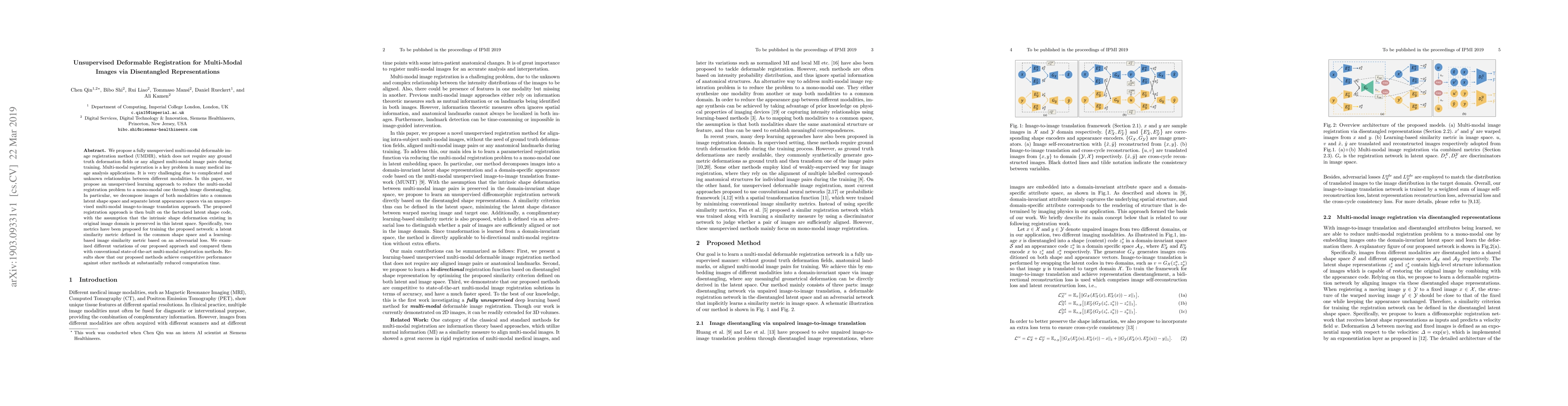 This paper introduces an unsupervised method for multi-modal deformable image registration, leveraging disentangled representations to decompose images into common shape and separate appearance spaces. The proposed approach achieves competitive performance compared to state-of-the-art methods with significantly reduced computational costs.