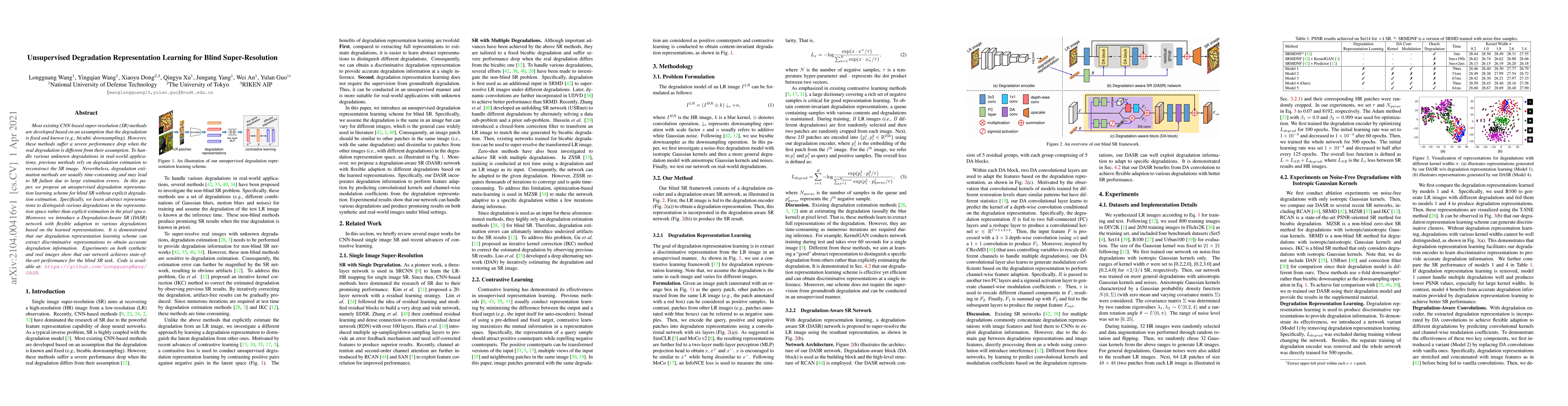 This paper presents an unsupervised method for blind super-resolution (SR) that learns abstract representations to distinguish various degradations without explicit estimation. The proposed Degradation-Aware SR (DASR) network achieves state-of-the-art performance on both synthetic and real images, demonstrating effective adaptation to unknown degradations.