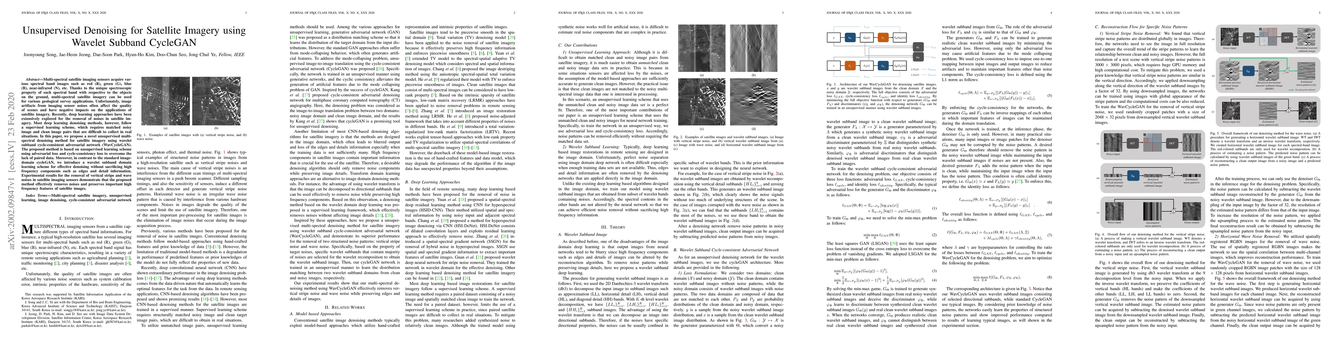 This paper proposes an unsupervised denoising method for satellite imagery using a wavelet subband cycle-consistent adversarial network (WavCycleGAN). The method leverages adversarial and cycle-consistency losses to effectively remove noise without paired training data, while preserving high-frequency details like edges.