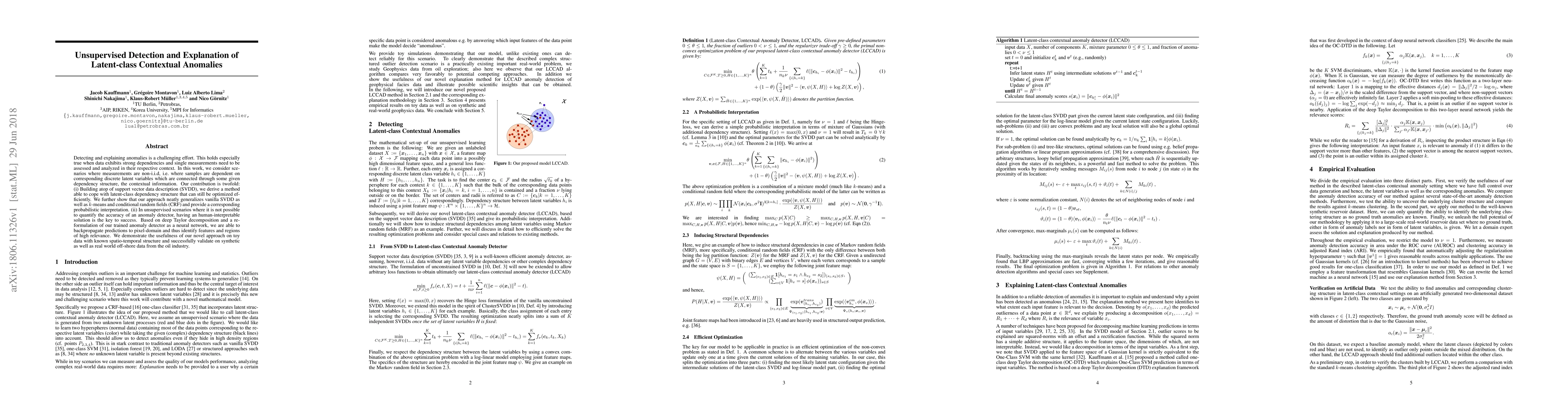 Detecting and explaining anomalies is a challenging effort. This holds especially true when data exhibits strong dependencies and single measurements need to be assessed and analyzed in their respective context. In this work, we consider scenarios where measurements are non-i.i.d, i.e. where samples are dependent on corresponding discrete latent variables which are connected through some given dependency structure, the contextual information. Our contribution is twofold: (i) Building atop of support vector data description (SVDD), we derive a method able to cope with latent-class dependency structure that can still be optimized efficiently. We further show that our approach neatly generalizes vanilla SVDD as well as k-means and conditional random fields (CRF) and provide a corresponding probabilistic interpretation. (ii) In unsupervised scenarios where it is not possible to quantify the accuracy of an anomaly detector, having an human-interpretable solution is the key to success. Based on deep Taylor decomposition and a reformulation of our trained anomaly detector as a neural network, we are able to backpropagate predictions to pixel-domain and thus identify features and regions of high relevance. We demonstrate the usefulness of our novel approach on toy data with known spatio-temporal structure and successfully validate on synthetic as well as real world off-shore data from the oil industry.