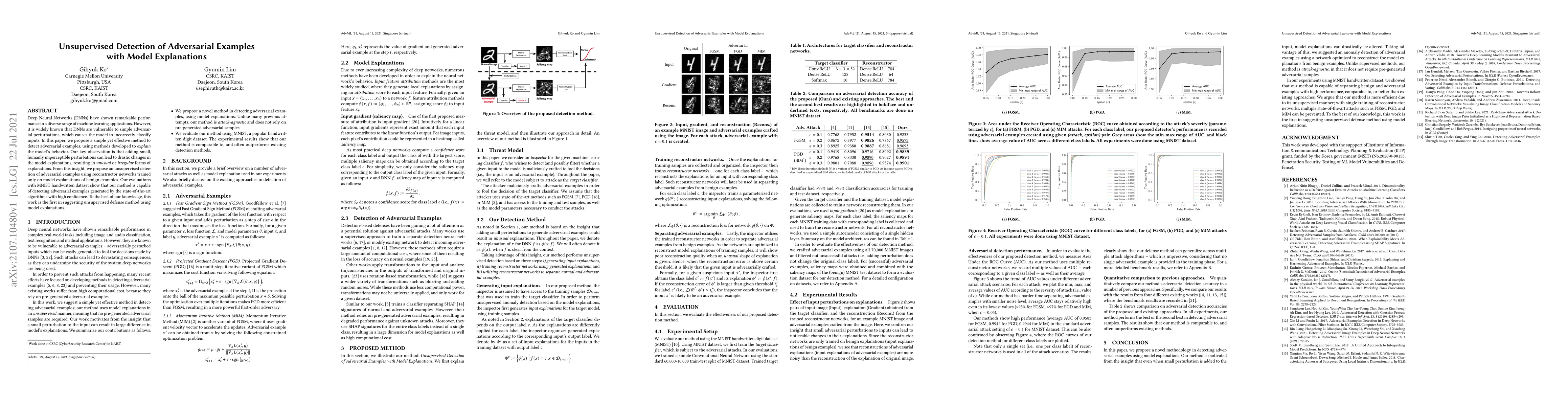 This paper proposes an unsupervised method to detect adversarial examples in DNNs by analyzing drastic changes in model explanations caused by imperceptible perturbations. The method trains reconstructor networks on benign examples' explanations and shows high detection confidence for adversarial examples in the MNIST dataset.