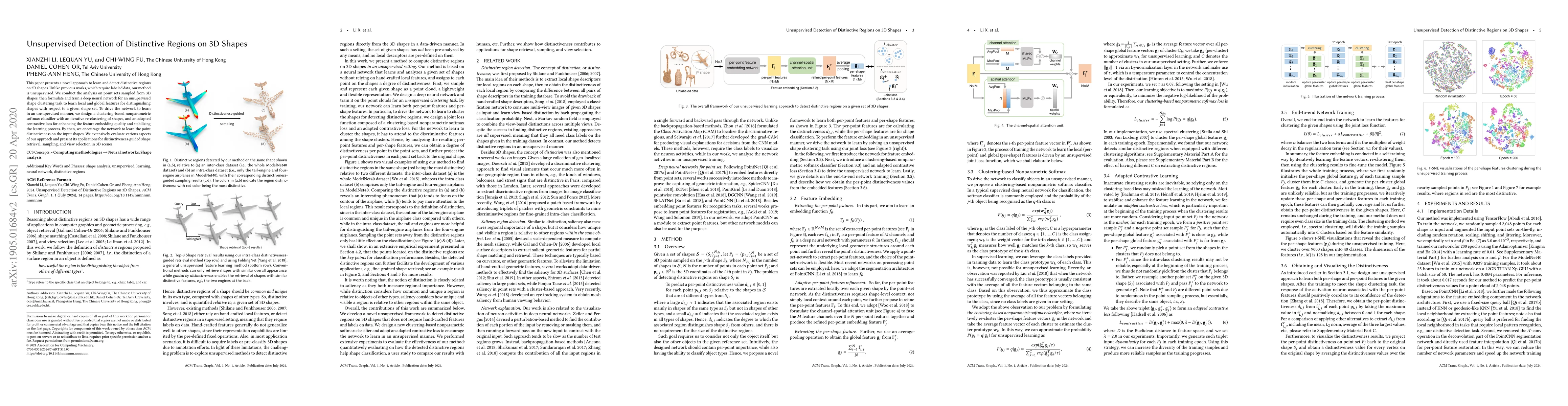This paper introduces an unsupervised method to detect distinctive regions on 3D shapes without labeled data. It uses a deep neural network and a clustering-based classifier to learn local and global features for distinguishing shapes in various applications.