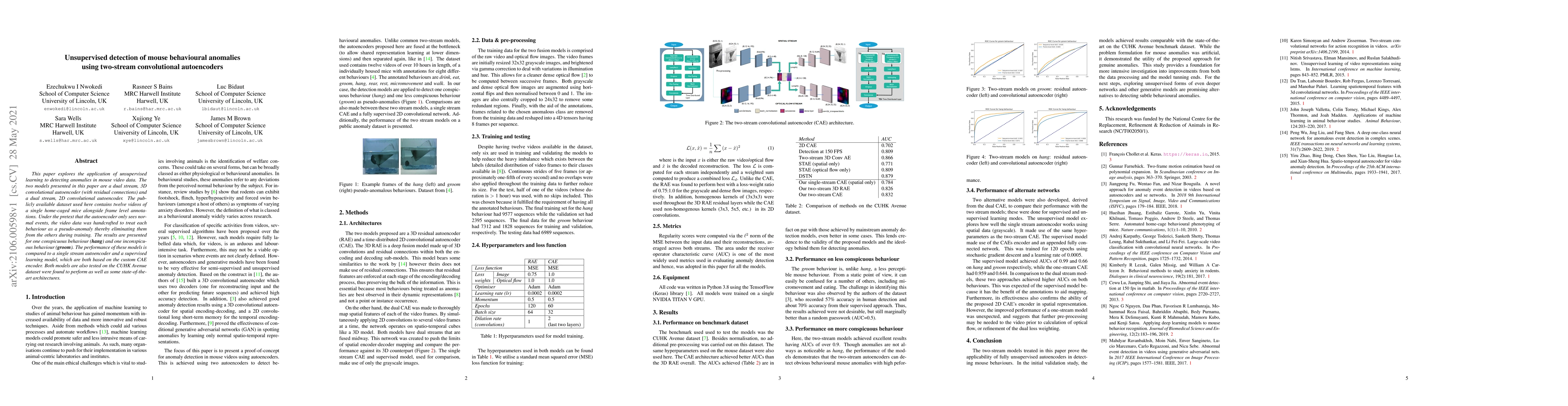 This paper employs unsupervised learning with dual-stream convolutional autoencoders to detect anomalies in mouse video data, achieving competitive results on the CUHK Avenue dataset. The study compares the performance of 3D and 2D autoencoders, finding them effective for identifying both conspicuous and inconspicuous behaviours.