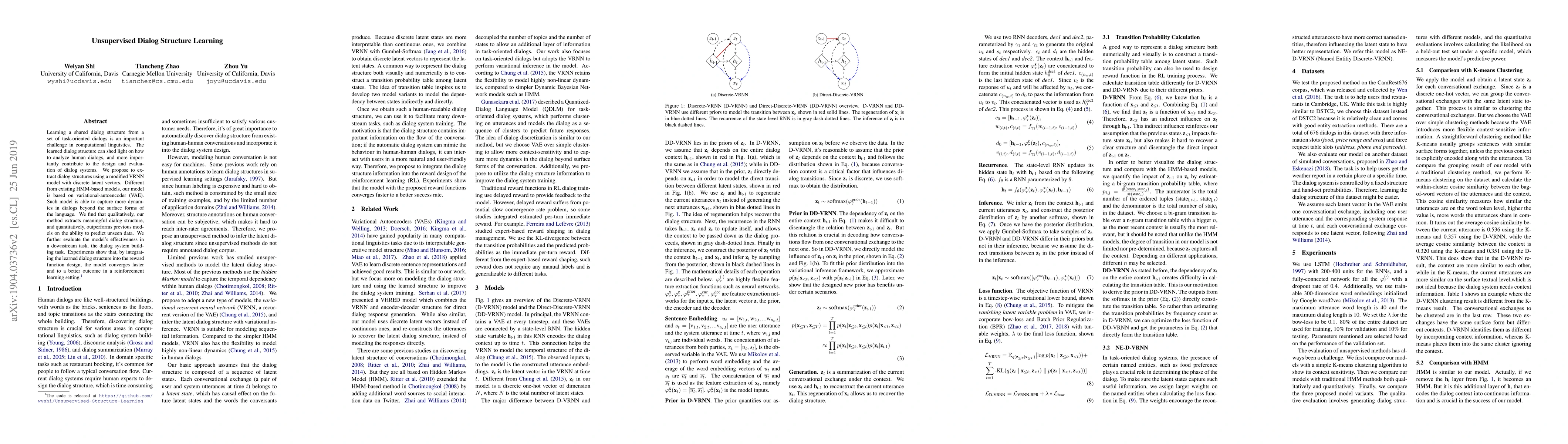 Learning a shared dialog structure from a set of task-oriented dialogs is an important challenge in computational linguistics. The learned dialog structure can shed light on how to analyze human dialogs, and more importantly contribute to the design and evaluation of dialog systems. We propose to extract dialog structures using a modified VRNN model with discrete latent vectors. Different from existing HMM-based models, our model is based on variational-autoencoder (VAE). Such model is able to capture more dynamics in dialogs beyond the surface forms of the language. We find that qualitatively, our method extracts meaningful dialog structure, and quantitatively, outperforms previous models on the ability to predict unseen data. We further evaluate the model's effectiveness in a downstream task, the dialog system building task. Experiments show that, by integrating the learned dialog structure into the reward function design, the model converges faster and to a better outcome in a reinforcement learning setting.