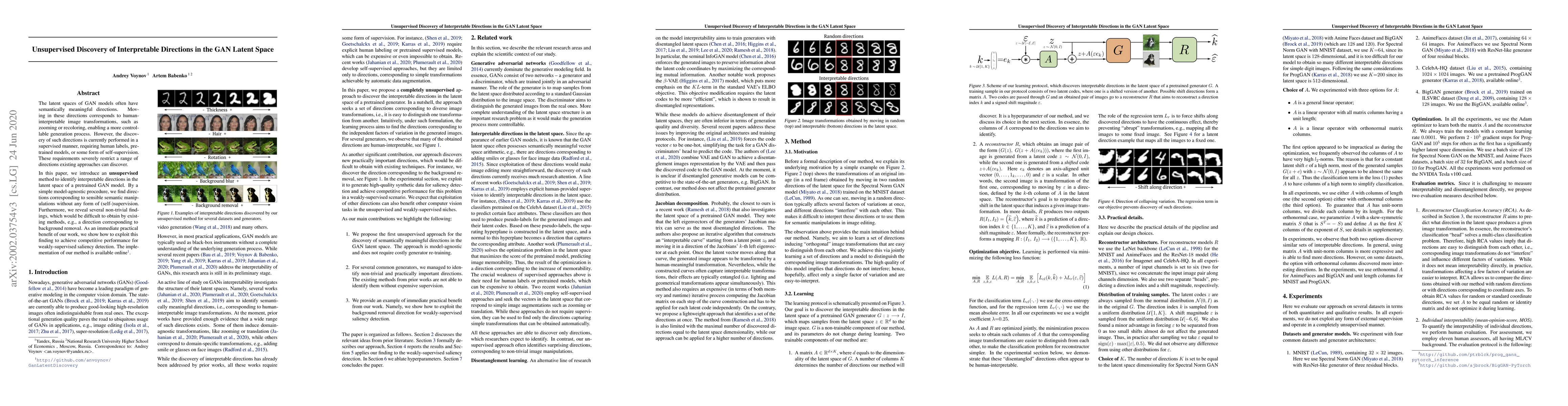 This paper presents an unsupervised method to identify interpretable directions in the latent space of a pretrained GAN model, enabling human-interpretable image transformations without requiring human labels or self-supervision. The method reveals non-trivial semantic manipulations, such as background removal, and demonstrates its practical benefit in achieving competitive performance for weakly-supervised saliency detection.