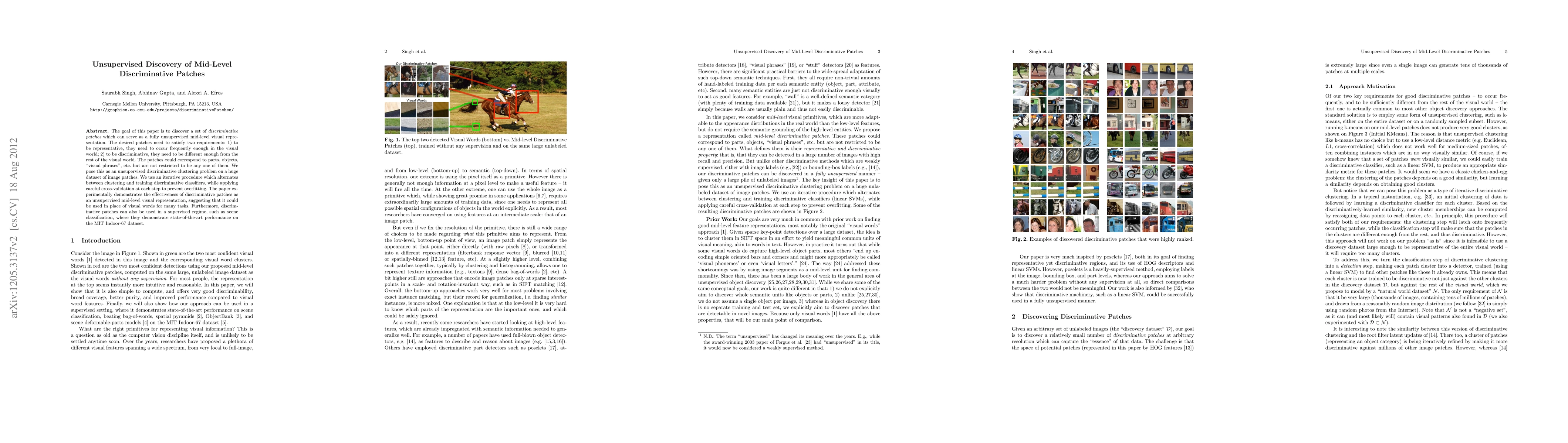 This paper proposes an unsupervised method to discover discriminative patches as mid-level visual representations, achieving state-of-the-art performance in scene classification tasks using the MIT Indoor-67 dataset. The method iteratively clusters image patches and trains classifiers to ensure both representativeness and distinctiveness, demonstrating their effectiveness as a replacement for visual words.