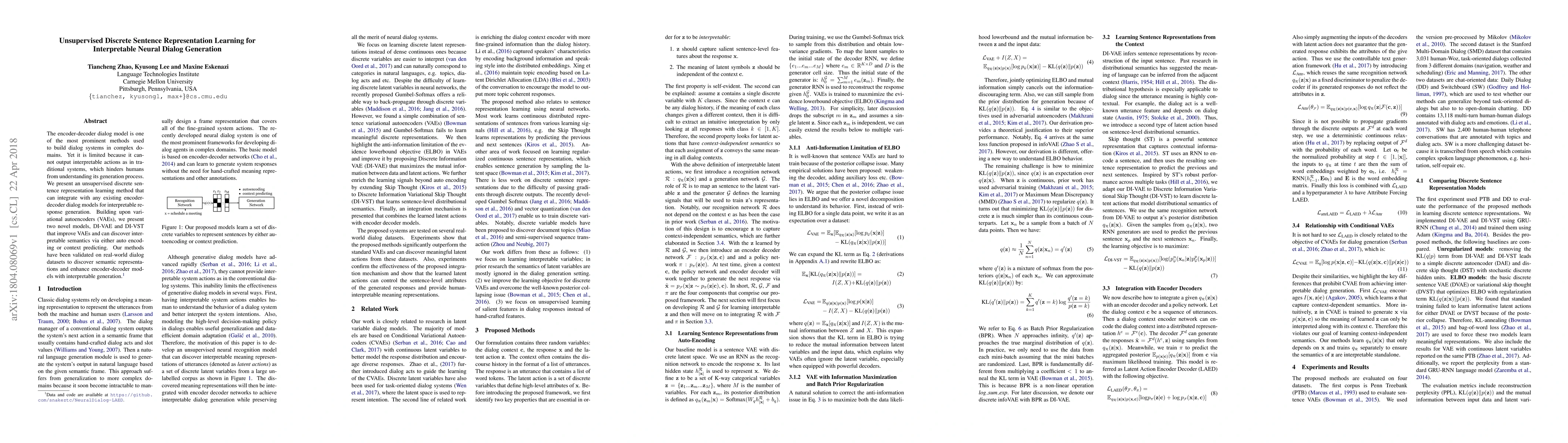 This paper introduces unsupervised discrete sentence representation learning methods, DI-VAE and DI-VST, to enhance encoder-decoder dialog models with interpretable response generation. These models improve upon variational autoencoders and have been validated on real-world datasets to discover semantic representations and improve model interpretability.