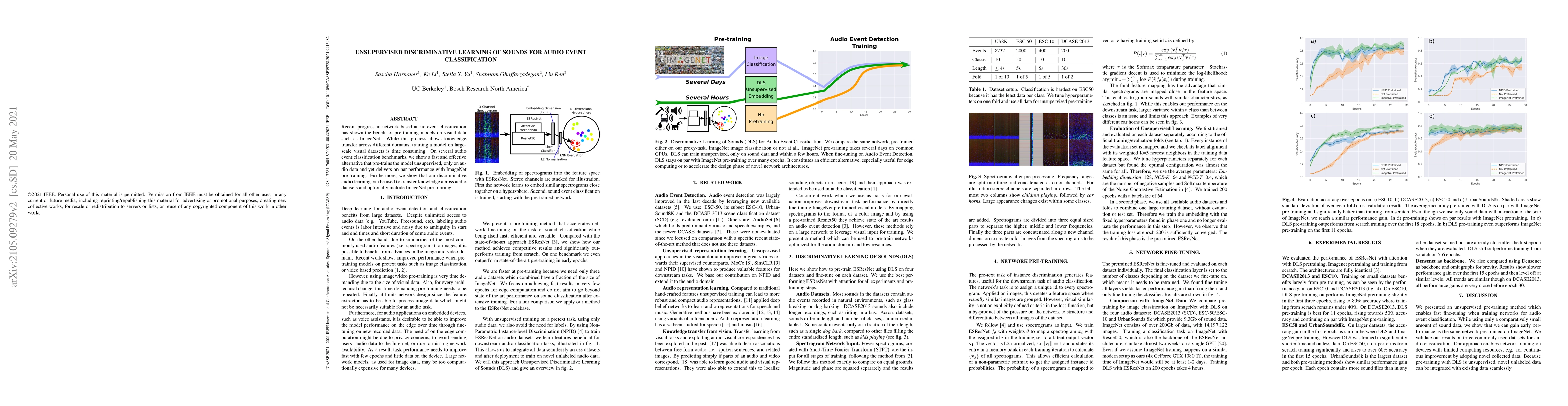 This paper proposes an unsupervised discriminative learning method for audio event classification that pre-trains models solely on audio data, achieving performance comparable to models pre-trained on large visual datasets like ImageNet, while being faster and more efficient. The method also demonstrates the ability to transfer knowledge across different audio datasets and can optionally include ImageNet pre-training.
