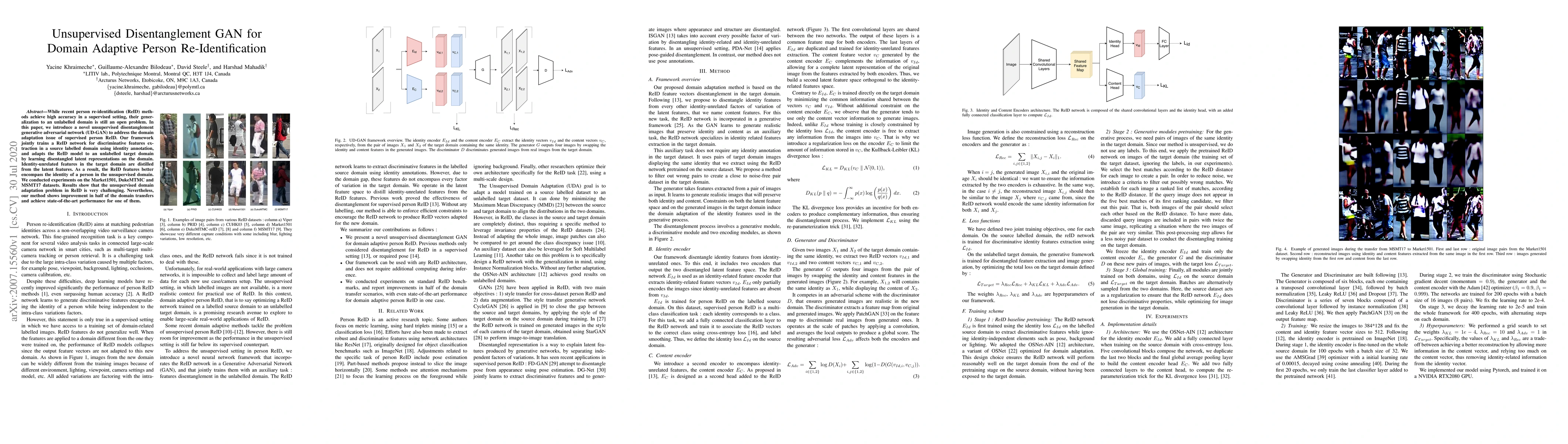 While recent person re-identification (ReID) methods achieve high accuracy in a supervised setting, their generalization to an unlabelled domain is still an open problem. In this paper, we introduce a novel unsupervised disentanglement generative adversarial network (UD-GAN) to address the domain adaptation issue of supervised person ReID. Our framework jointly trains a ReID network for discriminative features extraction in a source labelled domain using identity annotation, and adapts the ReID model to an unlabelled target domain by learning disentangled latent representations on the domain. Identity-unrelated features in the target domain are distilled from the latent features. As a result, the ReID features better encompass the identity of a person in the unsupervised domain. We conducted experiments on the Market1501, DukeMTMC and MSMT17 datasets. Results show that the unsupervised domain adaptation problem in ReID is very challenging. Nevertheless, our method shows improvement in half of the domain transfers and achieve state-of-the-art performance for one of them.