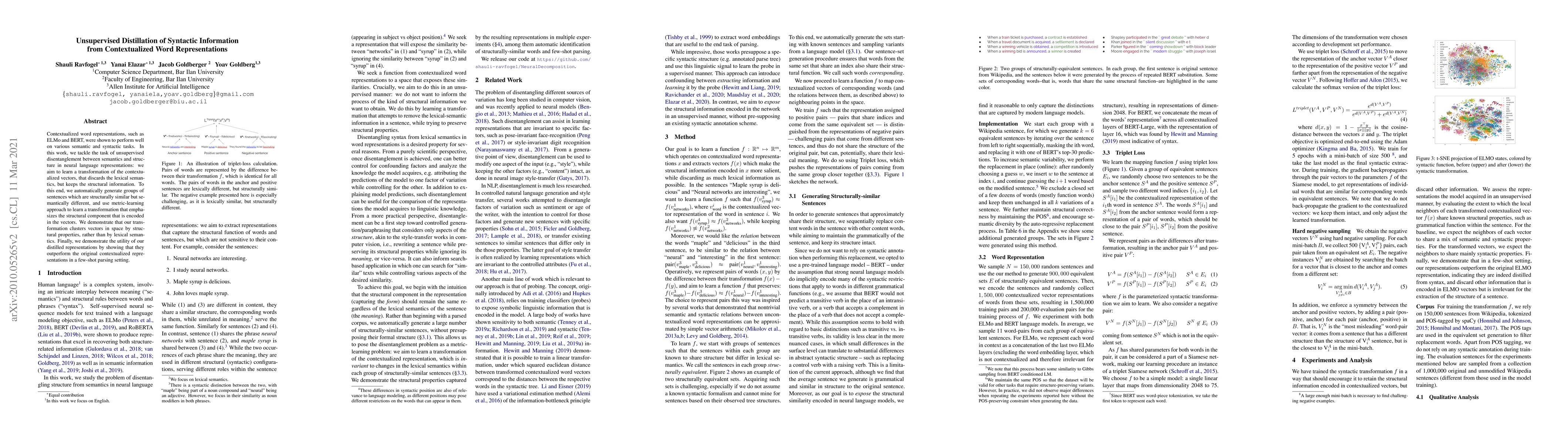 This paper proposes an unsupervised method to distill syntactic information from contextualized word representations, achieving better performance in few-shot parsing by emphasizing structural over semantic features. The approach involves generating structurally similar but semantically different sentences and using metric-learning to transform the representations.