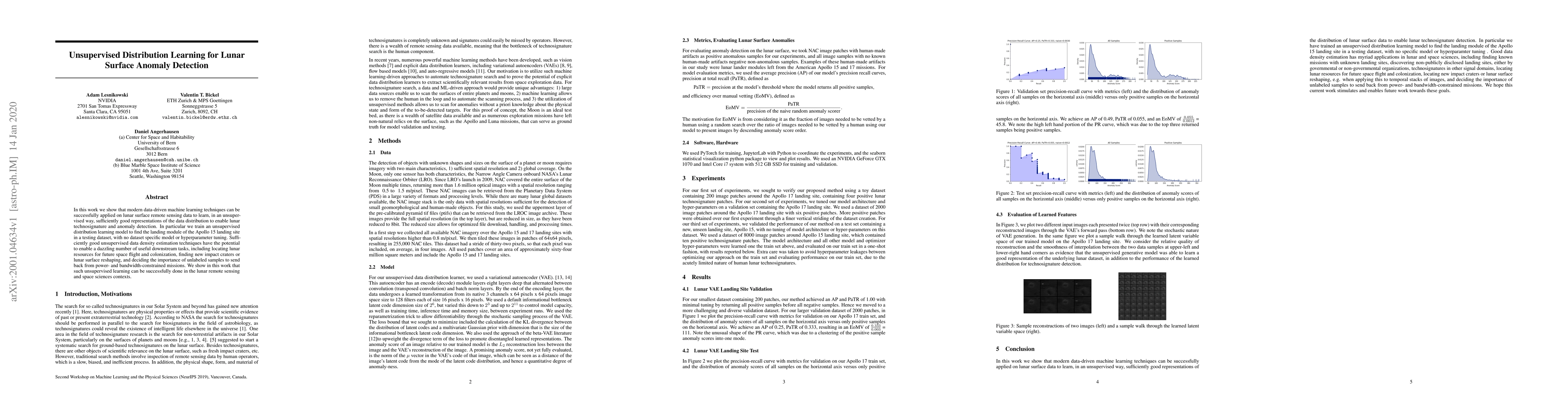 This paper demonstrates the application of unsupervised distribution learning for detecting lunar surface anomalies using remote sensing data, successfully identifying the Apollo 15 landing module without specific model tuning. The approach promises to enable various future space missions by locating resources and identifying new geological features.