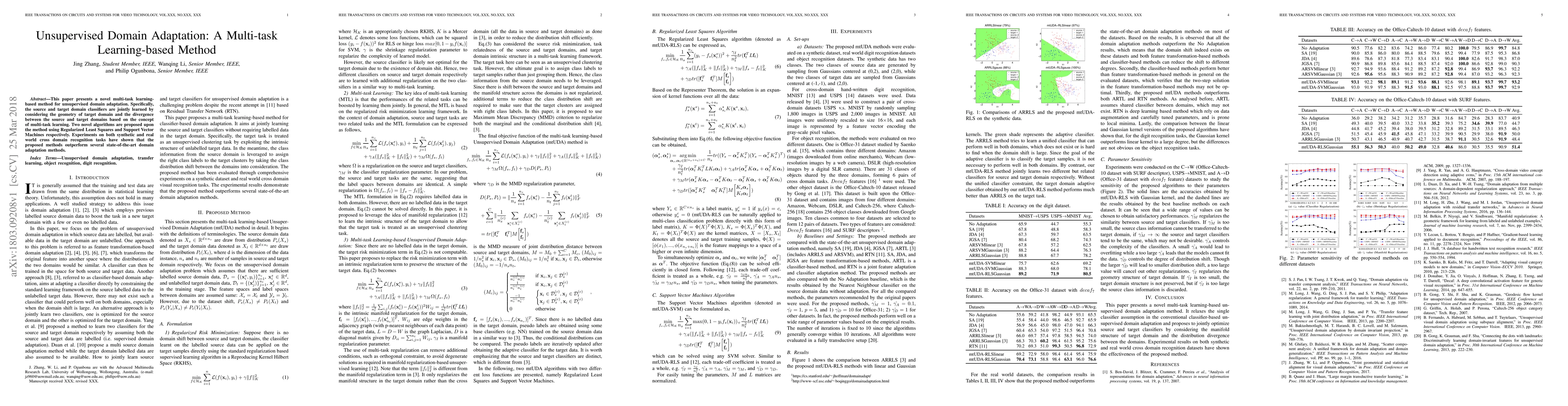 This paper introduces a multi-task learning approach for unsupervised domain adaptation, jointly learning source and target domain classifiers. Experiments demonstrate superior performance over existing methods on both synthetic and real-world cross domain recognition tasks.