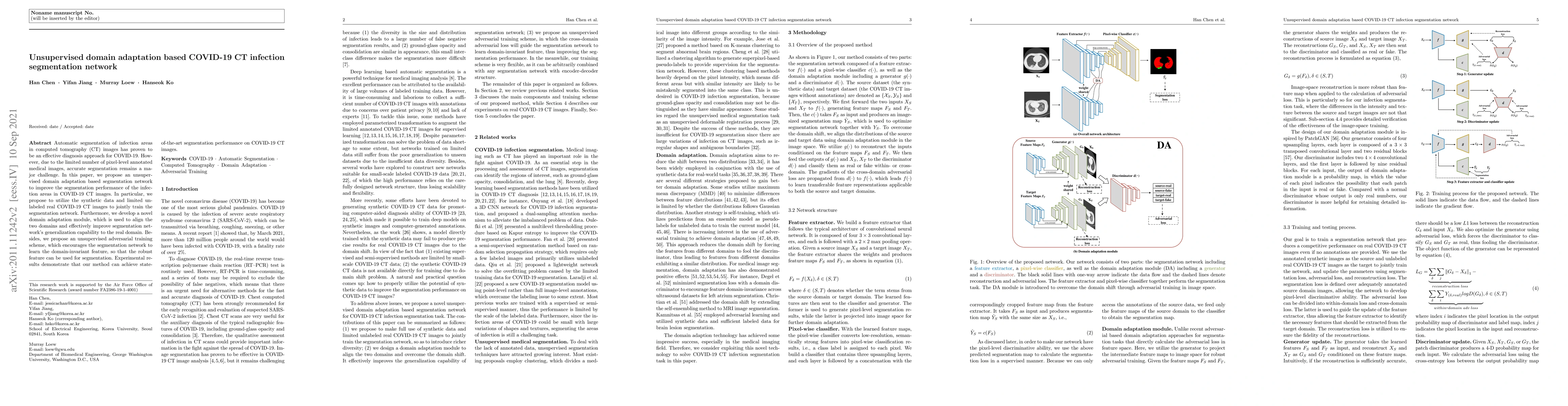 This paper proposes an unsupervised domain adaptation network to enhance the segmentation of COVID-19 infection areas in CT images, leveraging synthetic data and unlabeled real images to improve performance and generalization. The method includes a novel domain adaptation module and an unsupervised adversarial training scheme to learn domain-invariant features, achieving state-of-the-art results.