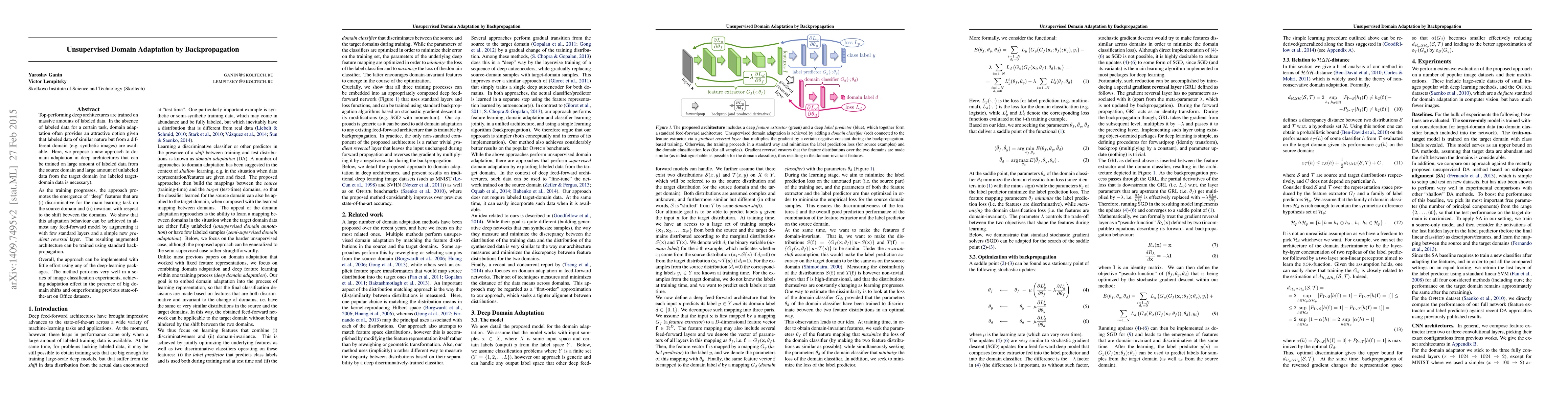 This paper proposes an unsupervised domain adaptation method for deep architectures that leverages backpropagation to train on labeled source data and unlabeled target data. The approach introduces a gradient reversal layer to promote feature invariance across domains, achieving state-of-the-art performance in image classification tasks with significant domain shifts.