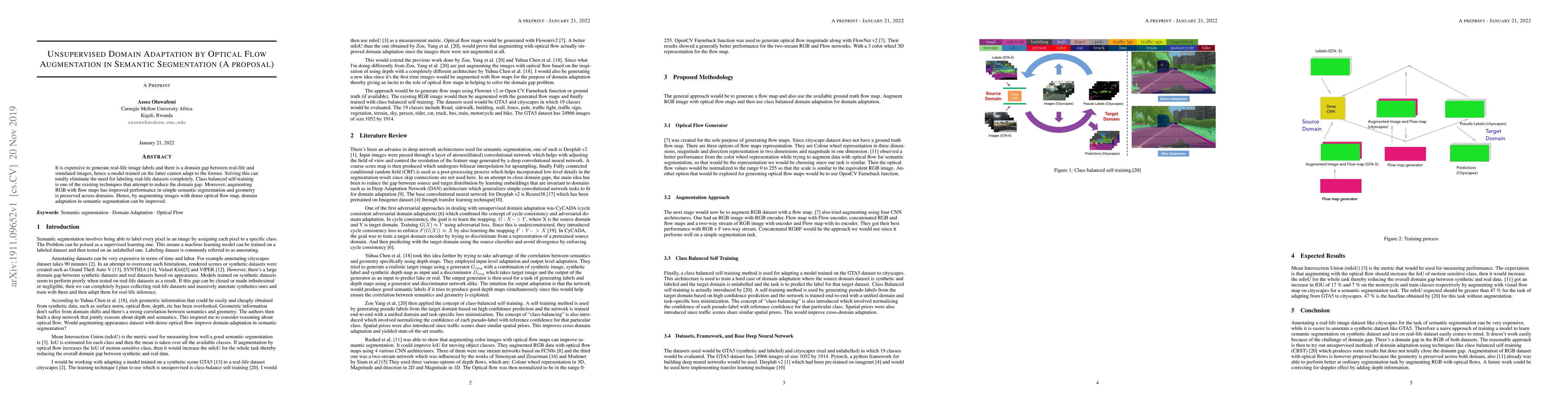 It is expensive to generate real-life image labels and there is a domain gap between real-life and simulated images, hence a model trained on the latter cannot adapt to the former. Solving this can totally eliminate the need for labeling real-life datasets completely. Class balanced self-training is one of the existing techniques that attempt to reduce the domain gap. Moreover, augmenting RGB with flow maps has improved performance in simple semantic segmentation and geometry is preserved across domains. Hence, by augmenting images with dense optical flow map, domain adaptation in semantic segmentation can be improved.