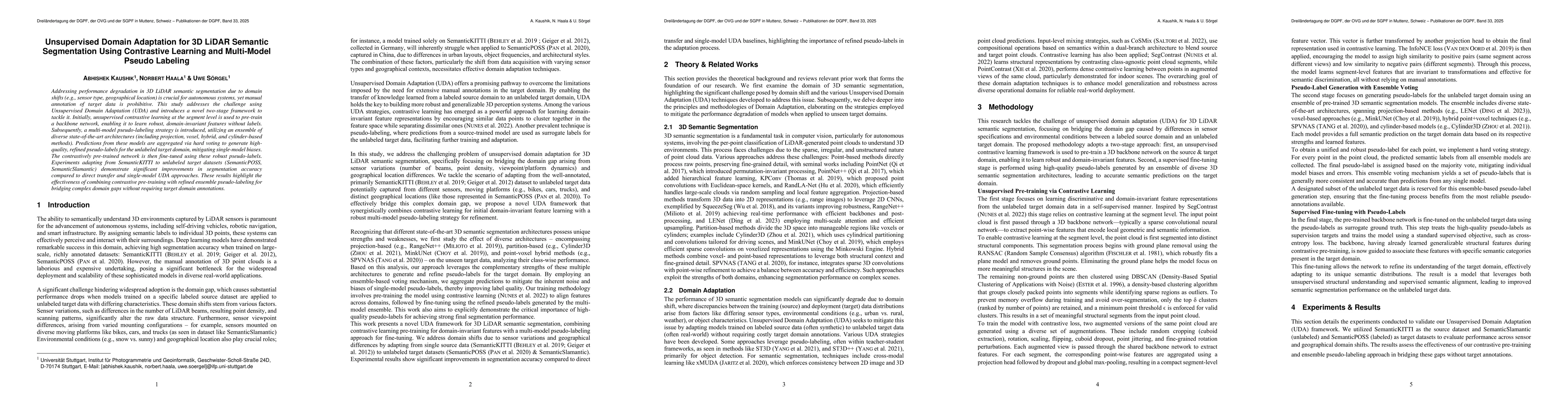 Addressing performance degradation in 3D LiDAR semantic segmentation due to domain shifts (e.g., sensor type, geographical location) is crucial for autonomous systems, yet manual annotation of target data is prohibitive. This study addresses the challenge using Unsupervised Domain Adaptation (UDA) and introduces a novel two-stage framework to tackle it. Initially, unsupervised contrastive learning at the segment level is used to pre-train a backbone network, enabling it to learn robust, domain-invariant features without labels. Subsequently, a multi-model pseudo-labeling strategy is introduced, utilizing an ensemble of diverse state-of-the-art architectures (including projection, voxel, hybrid, and cylinder-based methods). Predictions from these models are aggregated via hard voting to generate high-quality, refined pseudo-labels for the unlabeled target domain, mitigating single-model biases. The contrastively pre-trained network is then fine-tuned using these robust pseudo-labels. Experiments adapting from SemanticKITTI to unlabeled target datasets (SemanticPOSS, SemanticSlamantic) demonstrate significant improvements in segmentation accuracy compared to direct transfer and single-model UDA approaches. These results highlight the effectiveness of combining contrastive pre-training with refined ensemble pseudo-labeling for bridging complex domain gaps without requiring target domain annotations.