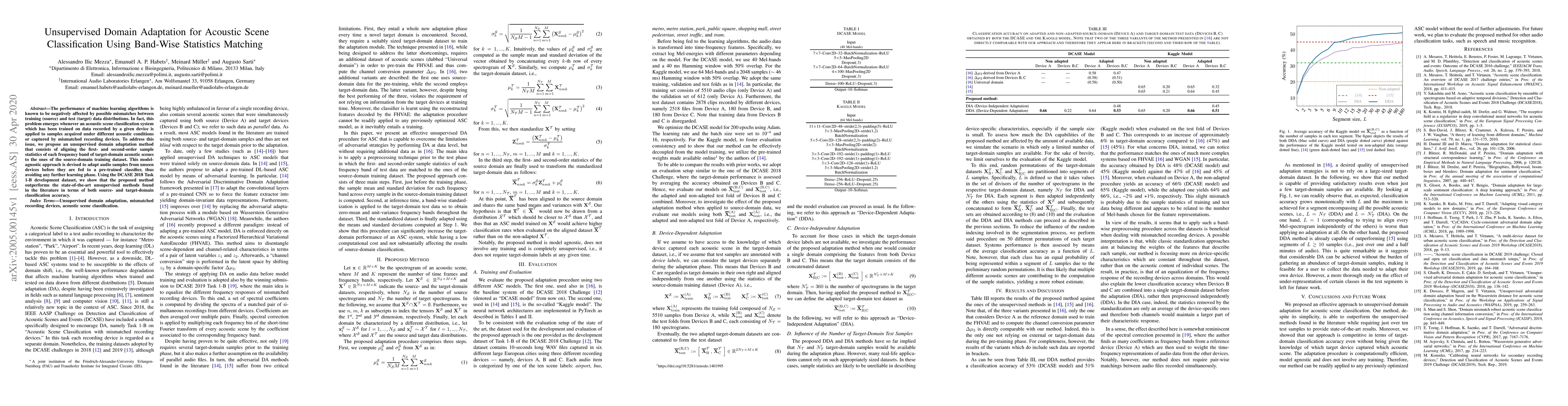 The performance of machine learning algorithms is known to be negatively affected by possible mismatches between training (source) and test (target) data distributions. In fact, this problem emerges whenever an acoustic scene classification system which has been trained on data recorded by a given device is applied to samples acquired under different acoustic conditions or captured by mismatched recording devices. To address this issue, we propose an unsupervised domain adaptation method that consists of aligning the first- and second-order sample statistics of each frequency band of target-domain acoustic scenes to the ones of the source-domain training dataset. This model-agnostic approach is devised to adapt audio samples from unseen devices before they are fed to a pre-trained classifier, thus avoiding any further learning phase. Using the DCASE 2018 Task 1-B development dataset, we show that the proposed method outperforms the state-of-the-art unsupervised methods found in the literature in terms of both source- and target-domain classification accuracy.