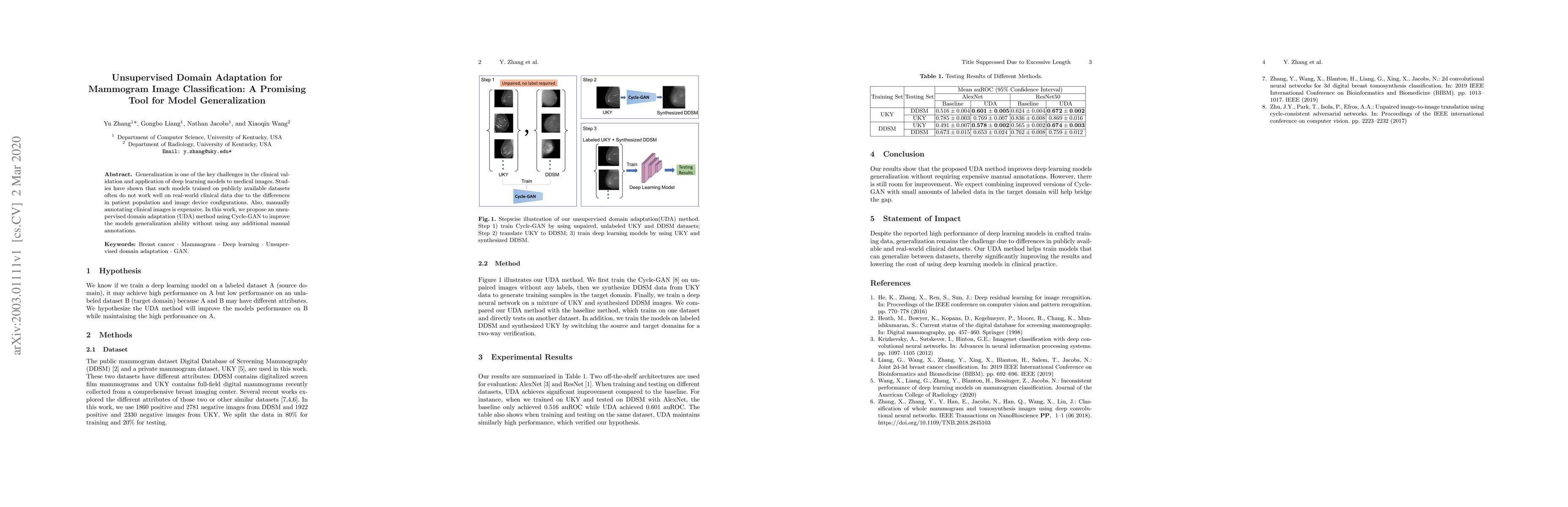 This paper proposes an unsupervised domain adaptation method using Cycle-GAN to enhance the generalization of deep learning models for mammogram image classification, addressing the challenge of model performance discrepancies between publicly available datasets and real-world clinical data. The approach aims to improve model accuracy without requiring additional manual annotations.