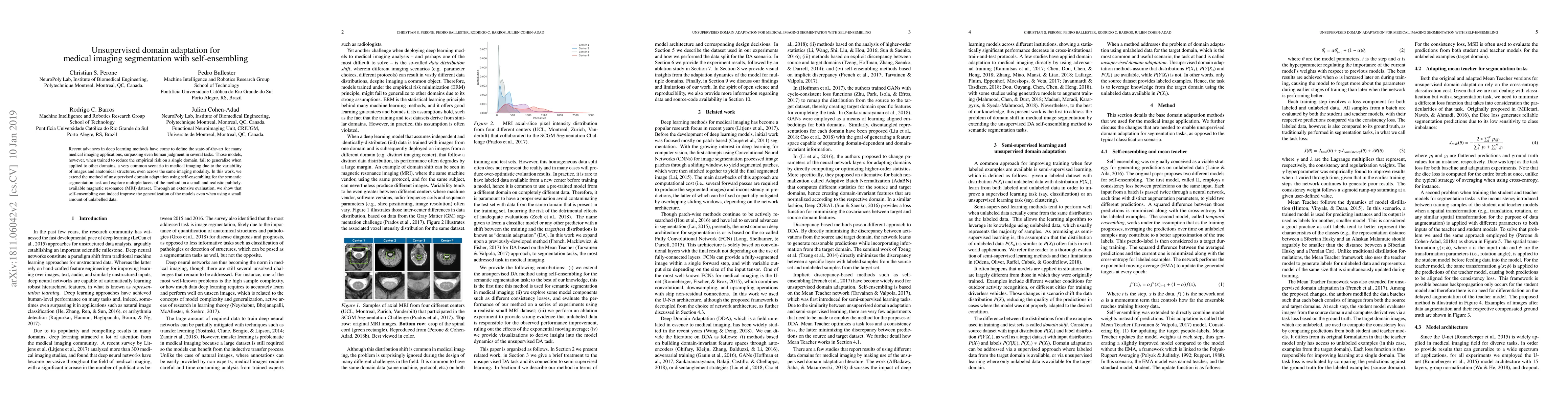This paper proposes an unsupervised domain adaptation method using self-ensembling to improve the generalization of deep learning models for medical imaging segmentation. The approach is evaluated on a small MRI dataset, demonstrating enhanced model performance with limited unlabelled data.