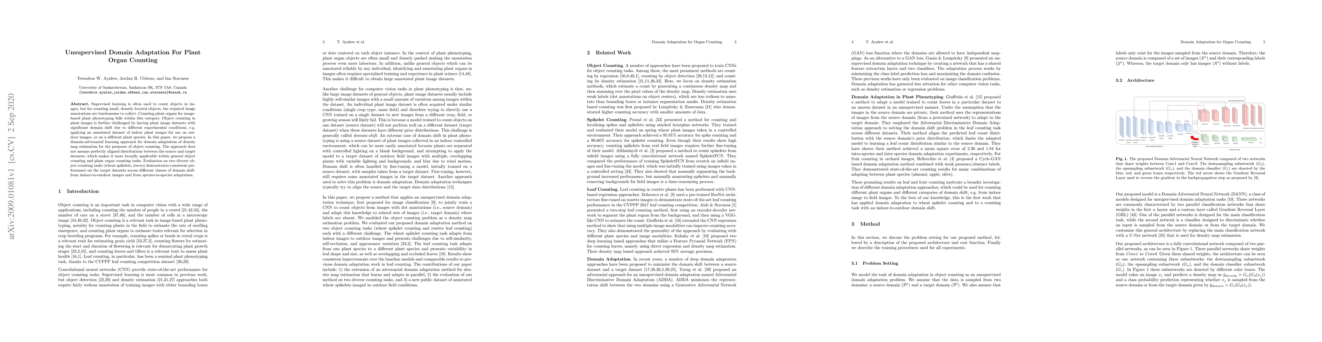 This paper proposes a domain-adversarial learning method for unsupervised domain adaptation to count plant organs in images, addressing the challenges of domain shift and the difficulty of collecting annotations. The method shows consistent performance across different domain shifts in tasks involving wheat spikelets and leaves.