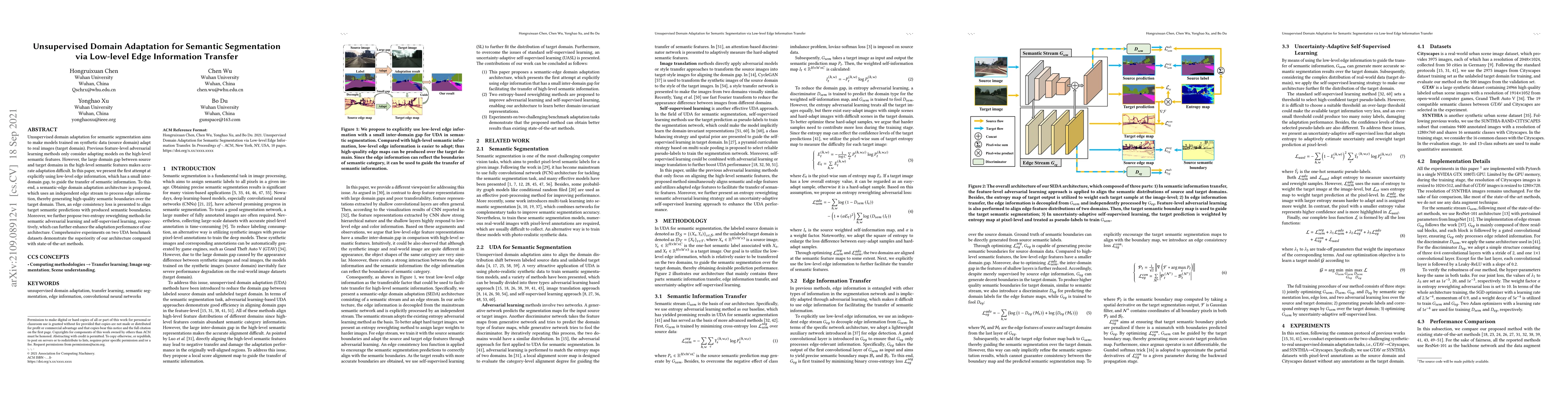This paper proposes a semantic-edge domain adaptation architecture for unsupervised domain adaptation in semantic segmentation, leveraging low-level edge information to bridge the domain gap. The method includes an edge stream and an edge consistency loss, along with entropy reweighting techniques to enhance adaptation performance, outperforming state-of-the-art methods in experiments.