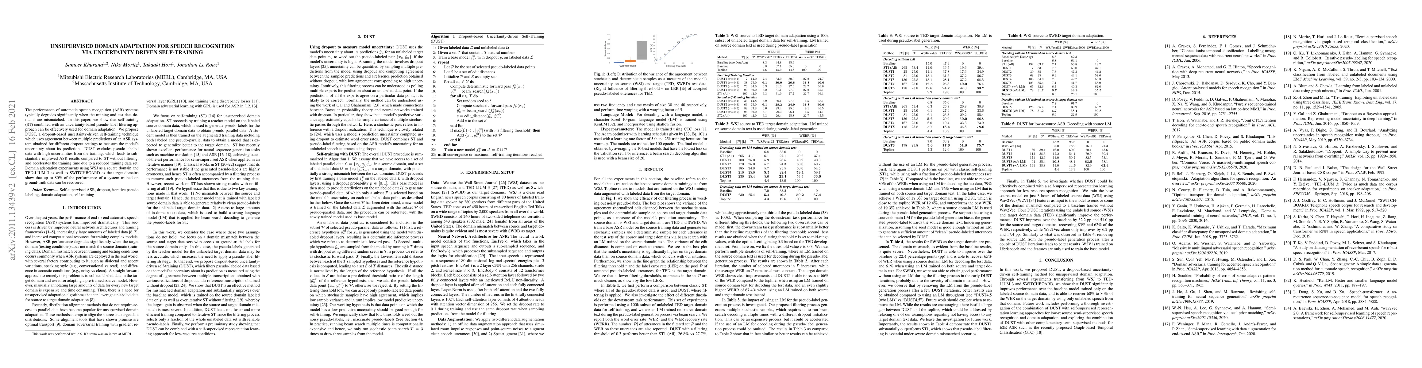 This paper proposes a self-training technique for speech recognition that uses uncertainty to filter out noisy data, achieving improved performance with up to 80% recovery of system performance when adapting to mismatched domains.