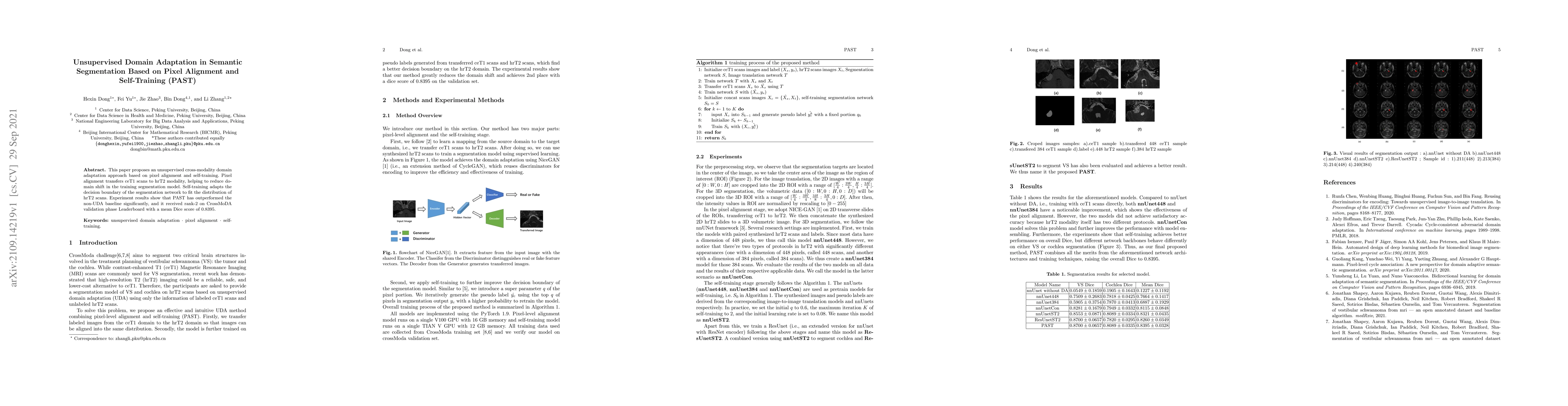 This paper introduces an unsupervised domain adaptation method for semantic segmentation using pixel alignment and self-training to bridge the domain gap between ceT1 and hrT2 modalities. The proposed PAST approach significantly outperforms non-UDA baselines, achieving a mean Dice score of 0.8395 and ranking second on the CrossMoDA leaderboard.