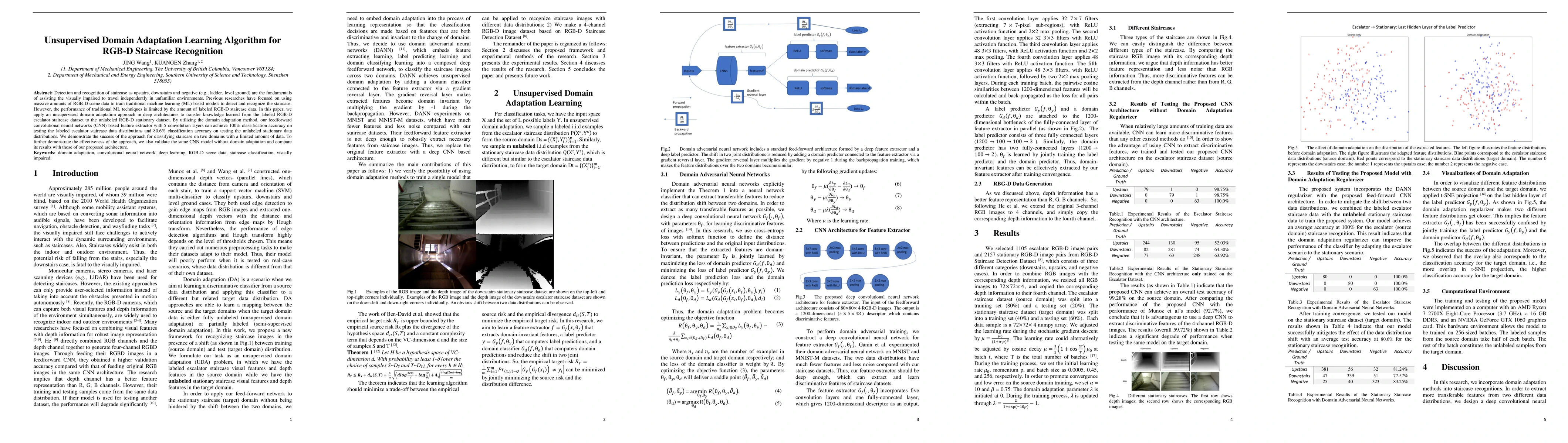 This paper proposes an unsupervised domain adaptation algorithm to improve RGB-D staircase recognition, achieving 100% accuracy on labeled data and 80.6% on unlabeled escalator data. The method transfers knowledge from a labeled stationary dataset to an unlabeled escalator dataset, demonstrating significant performance gains over traditional models.