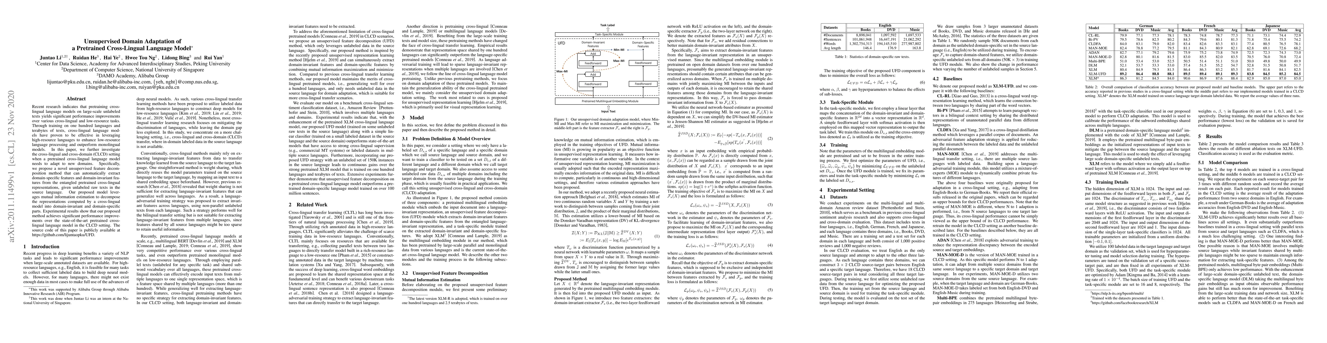 This paper proposes an unsupervised method for domain adaptation in pretrained cross-lingual language models by decomposing representations into domain-invariant and domain-specific features, significantly improving performance in cross-lingual and cross-domain settings. The method uses mutual information estimation and outperforms existing models in the specified task.