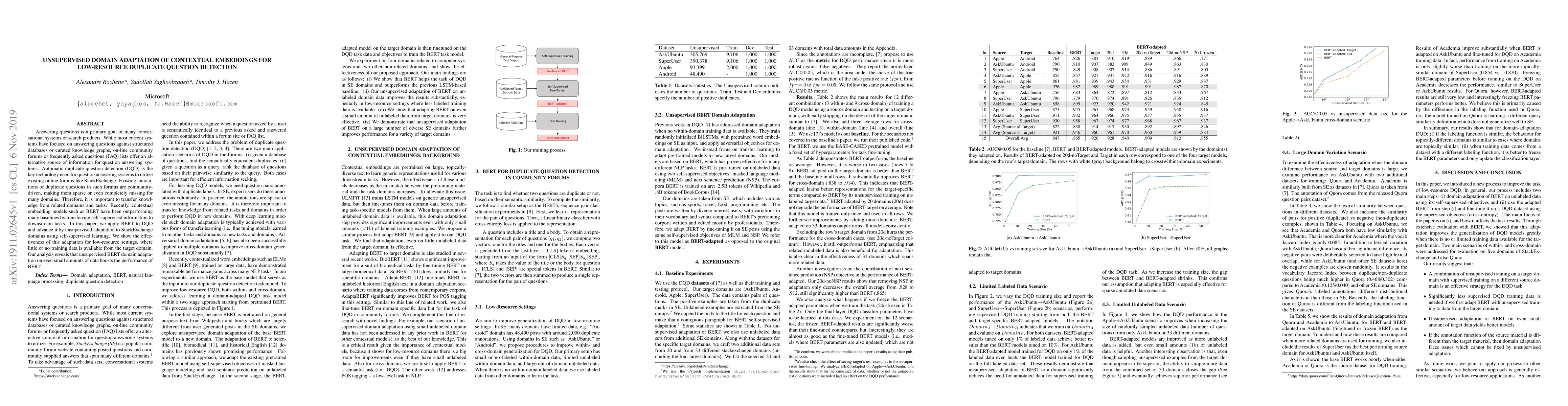 Researchers improved a question answering system's ability to detect duplicate questions in online forums by adapting a popular language model, BERT, using self-supervised learning without prior training data from the target domain.