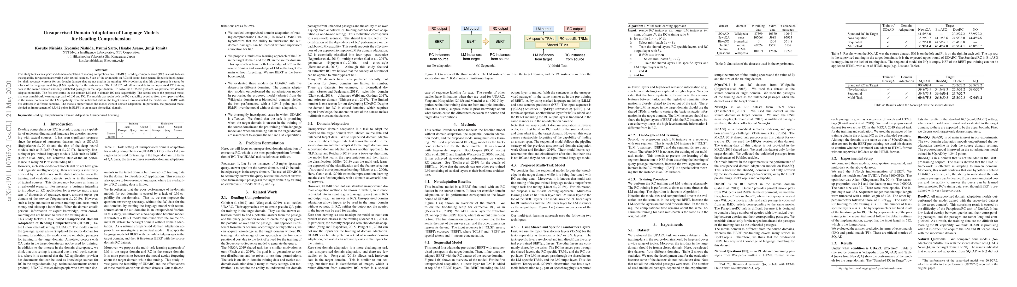 This study proposes unsupervised domain adaptation techniques for reading comprehension, introducing two models that improve language modeling to enhance question answering across different domains. The proposed multi-task learning approach significantly outperformed baseline models, achieving a notable 4.3/4.2 point increase in EM/F1 on an unseen biomedical domain.