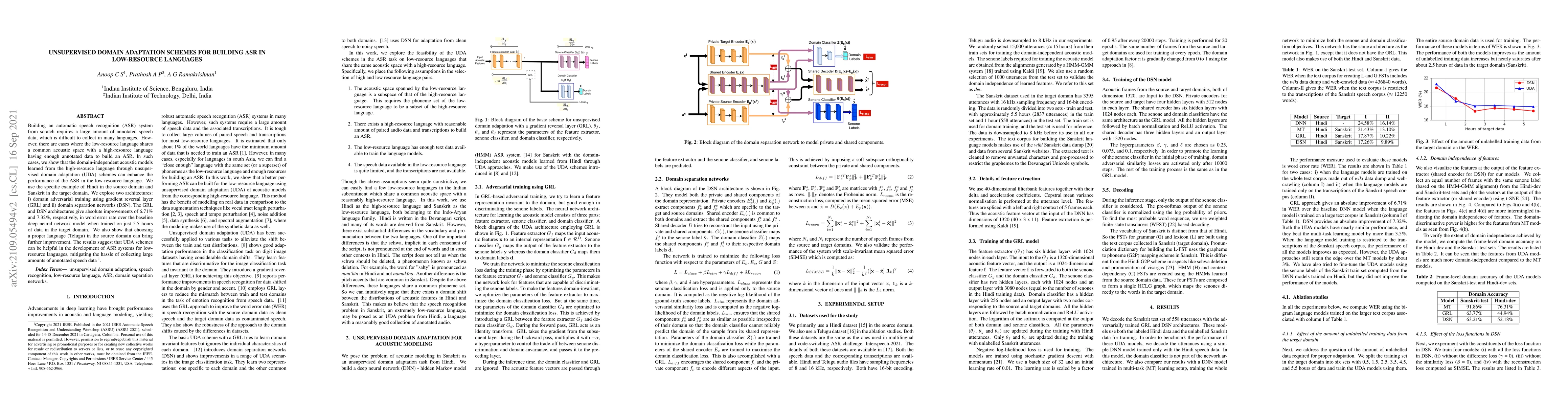This paper explores unsupervised domain adaptation (UDA) techniques to enhance automatic speech recognition (ASR) in low-resource languages, using Hindi as the source and Sanskrit as the target. Two UDA architectures, domain adversarial training and domain separation networks, achieve significant improvements in word error rate over a baseline model, demonstrating the potential of UDA to mitigate data collection challenges.