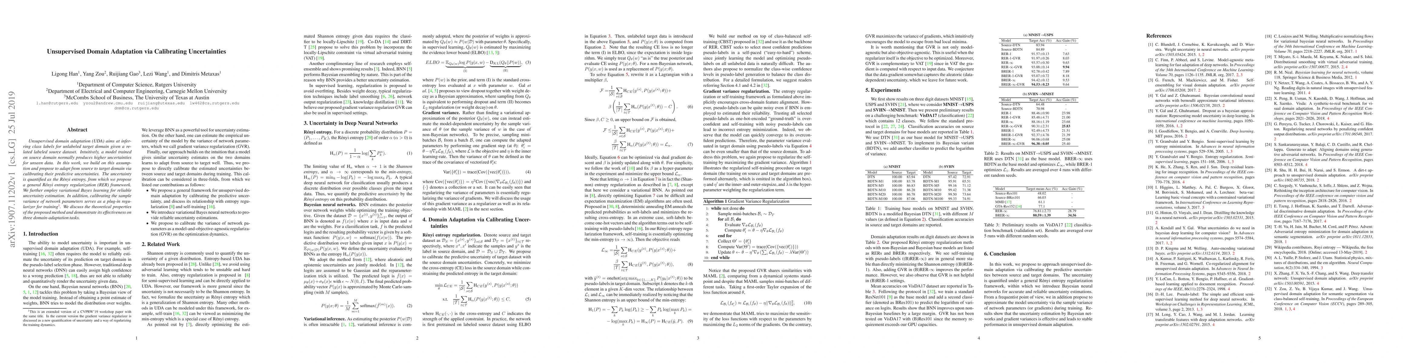 This paper proposes a method for unsupervised domain adaptation by calibrating predictive uncertainties between source and target domains, using Renyi entropy regularization and variational Bayes learning for reliable uncertainty estimation. The approach is shown to be effective across three domain-adaptation tasks.