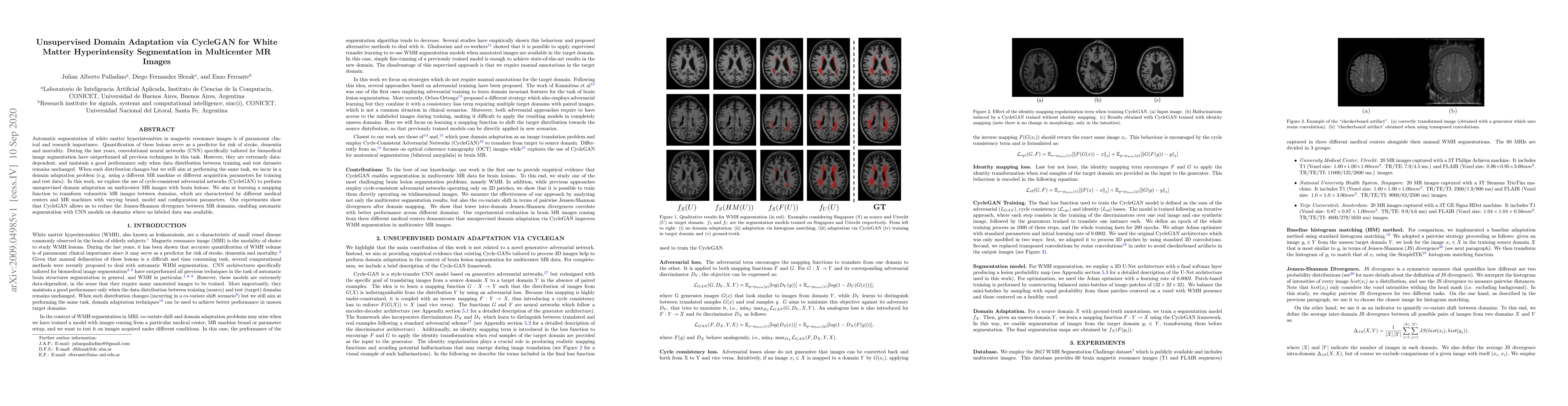 This paper proposes using CycleGAN for unsupervised domain adaptation to automatically segment white matter hyperintensities in multicenter MR images, addressing the challenge of differing data distributions across medical centers. The method effectively reduces domain divergence, enabling CNN models to perform segmentation without labeled data from new domains.