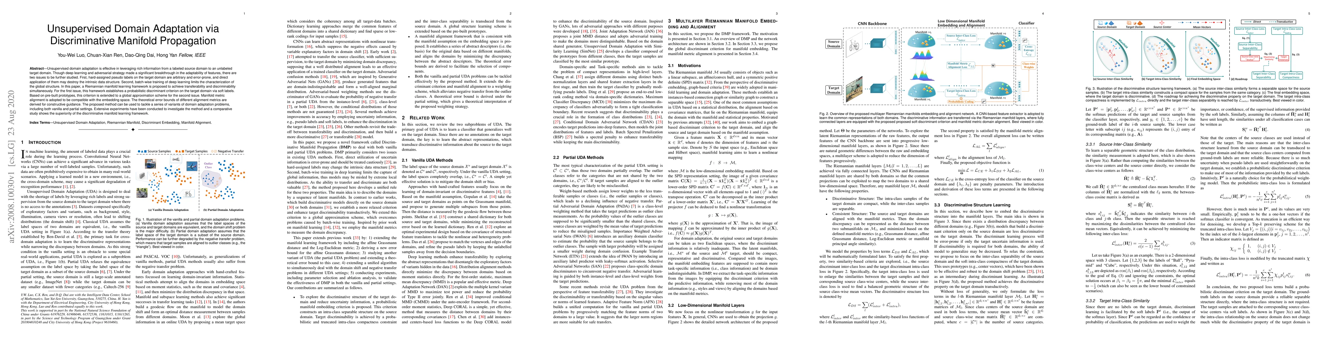 Unsupervised domain adaptation is effective in leveraging rich information from a labeled source domain to an unlabeled target domain. Though deep learning and adversarial strategy made a significant breakthrough in the adaptability of features, there are two issues to be further studied. First, hard-assigned pseudo labels on the target domain are arbitrary and error-prone, and direct application of them may destroy the intrinsic data structure. Second, batch-wise training of deep learning limits the characterization of the global structure. In this paper, a Riemannian manifold learning framework is proposed to achieve transferability and discriminability simultaneously. For the first issue, this framework establishes a probabilistic discriminant criterion on the target domain via soft labels. Based on pre-built prototypes, this criterion is extended to a global approximation scheme for the second issue. Manifold metric alignment is adopted to be compatible with the embedding space. The theoretical error bounds of different alignment metrics are derived for constructive guidance. The proposed method can be used to tackle a series of variants of domain adaptation problems, including both vanilla and partial settings. Extensive experiments have been conducted to investigate the method and a comparative study shows the superiority of the discriminative manifold learning framework.