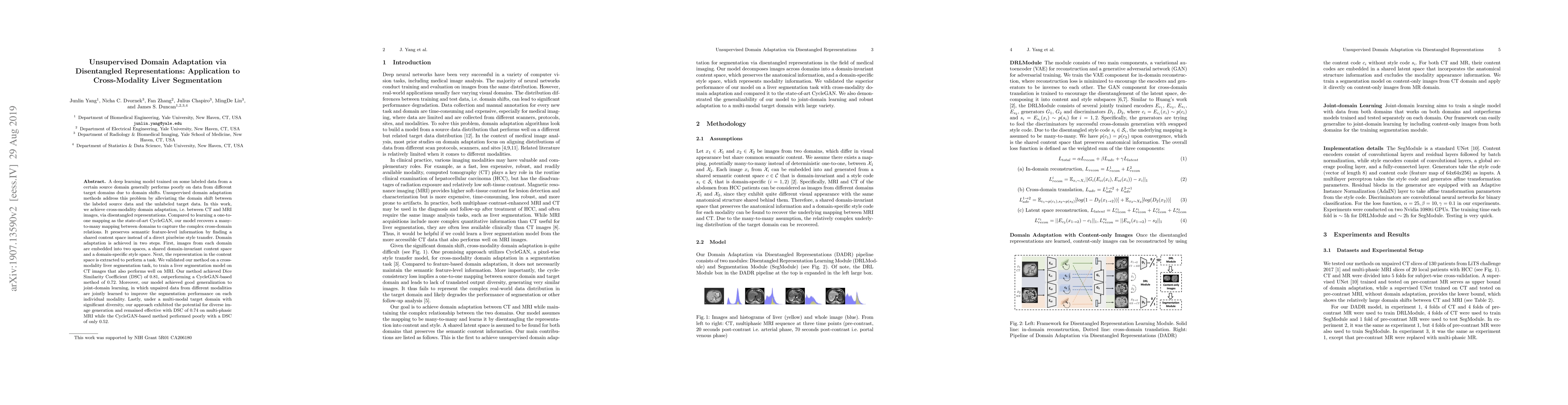 This paper proposes an unsupervised domain adaptation method using disentangled representations to address cross-modality domain shifts between CT and MRI images for liver segmentation. It outperforms CycleGAN by capturing complex cross-domain relations and achieving a Dice Similarity Coefficient (DSC) of 0.81, demonstrating superior generalization and diverse image generation capabilities.
