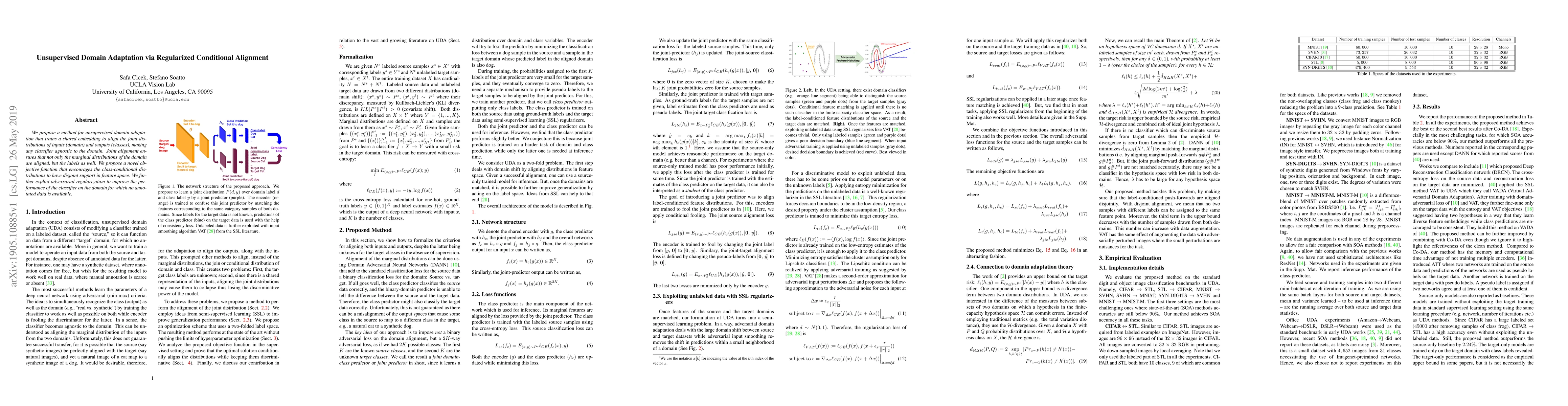 This paper introduces a method for unsupervised domain adaptation that aligns the joint distributions of inputs and outputs through a shared embedding, ensuring label and domain distribution alignment. It employs a novel objective function and adversarial regularization to enhance classifier performance on the unlabeled domain.